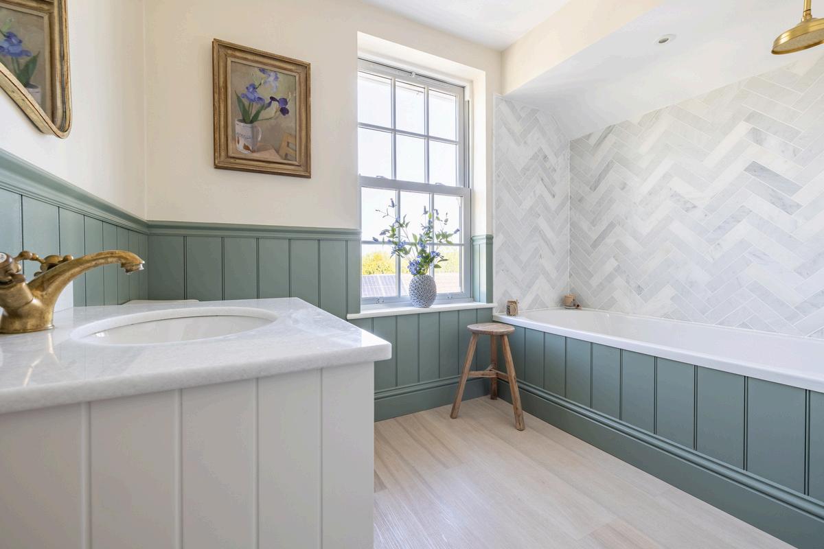 The family bathroom is beautifully presented, painted in Farrow & Ball tones with Claybrook marble tiles and a marble top vanity unit, tongue and groove half-panelled walls, a bath with shower over, and elegant brushed brass fittings - a space that perfectly complements the overall style of the house