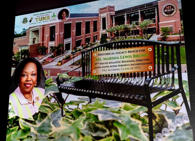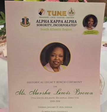 Alpha Kappa Alpha Sorority, Incorporated® South Atlantic Regional Director Soror Tiffany Moore Russell joined other international and national dignitaries and members of the organization, along with university officials, to proudly honor the legacy of Soror Marsha Lewis Brown, 17th South Atlantic Regional Director, with the dedication of a legacy bench at Florida State University, Tallahassee, where she earned both her undergraduate and graduate degrees. She is the first African American woman to have a bench dedicated in her honor at FSU. A Golden Member and trailblazing leader, Soror Marsha’s administration (2010–2014) advanced service, sustainability, and sisterhood while leading the South Atlantic Region to historic membership growth. This dedication celebrated a life of impact and marked the start of Florida AKA Day at the Capitol, honoring impact, legacy, and service that uplift communities