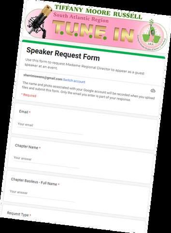 Find the Regional Director Speaker Request Form on our website at AKA1908.com/southatlantic under the “Contact Us” tab. Please submit your requests within a minimum of 30 days in advance of the date you need her to provide a message in person, in writing or in a video recording.