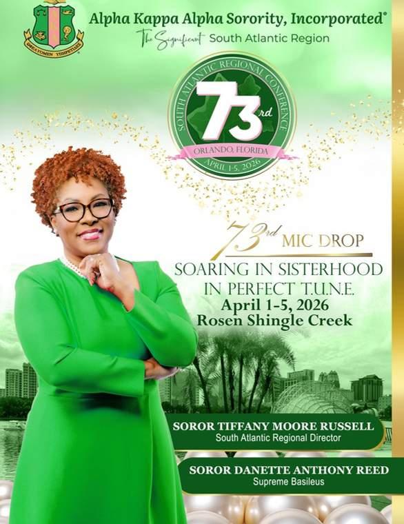 Now, it’s time to keep the momentum going as we prepare for the 73rd South Atlantic Regional Conference the final conference of the T.U.N.E. administration! Cluster I is excited to welcome you to Orlando, Florida, April 1–5, 2026. Our theme, “73rd Mic Drop: Soaring in Sisterhood in Perfect T.U.N.E.,” sets the tone for a conference filled with engaging activities, invaluable workshops, motivational messages, a defining call to action, and meaningful fellowship with Sorors from across the region. We cannot wait to welcome you to Orlando, the City Beautiful, and experience this historic moment together.