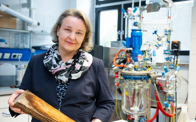 macht Pflanzen und Bäume stabil. In der Holzverarbeitung, zum Beispiel bei der Papierproduktion, fallen grosse Mengen davon als Nebenprodukt an. «Wenn wir mit Lignin arbeiten wollen, ist die Steiermark der perfekte Ort», lacht Barta, die seit 2019 eine Professur für Chemie an der Universität Graz innehat und den Bereich «nachhaltige Katalyse» leitet. Im Rahmen des vom Österreichischen Wissenschaftsfonds geförderten Projekts «WoodValue: Nachhaltige Wege zu bioaktiven Heterocyclen aus Holz» möchte sie aus Lignin neue bioaktive Moleküle und Medikamente gewinnen.