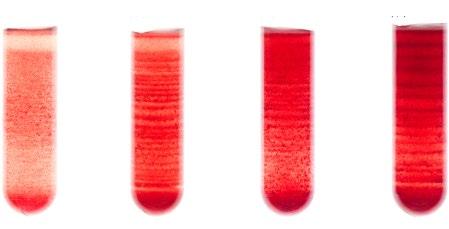 Zentrifugiert man rote Blutkörperchen, sammeln sich die Zellen in roten «Streifen» von oben nach unten. Das liegt nicht am unregelmässigen Wasserverlust der Blutzellen.