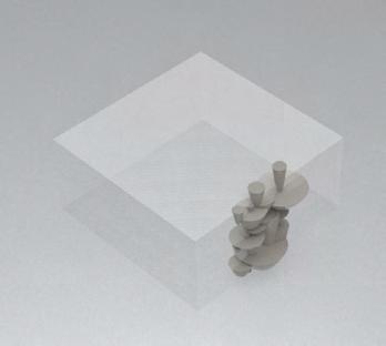 Then we used our mobile phone to 3D scan these "stone papers". So. the resulting mesh we got from 3D scan can be manipulated in Rhino. We have a logic to make each stone have a certain connection method. In order to make the subsequent operations feasible and not too complicated, a stone can only be connected to two stones at most (one on the same plane and the stone above). Then we get a cluster composed of 9 different meshes. Rotating the first cluster by a certain angle, we get the second cluster. Then we stack the two clusters vertically. Finally, we use a cube to cut it. In this way, we get a pillar. At this point, the operation on the computer is completed.
