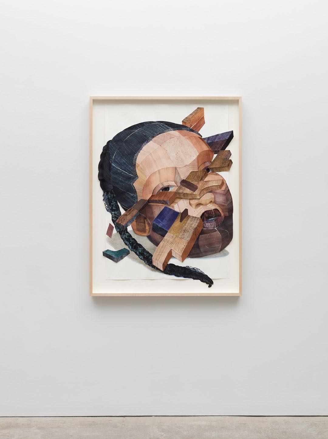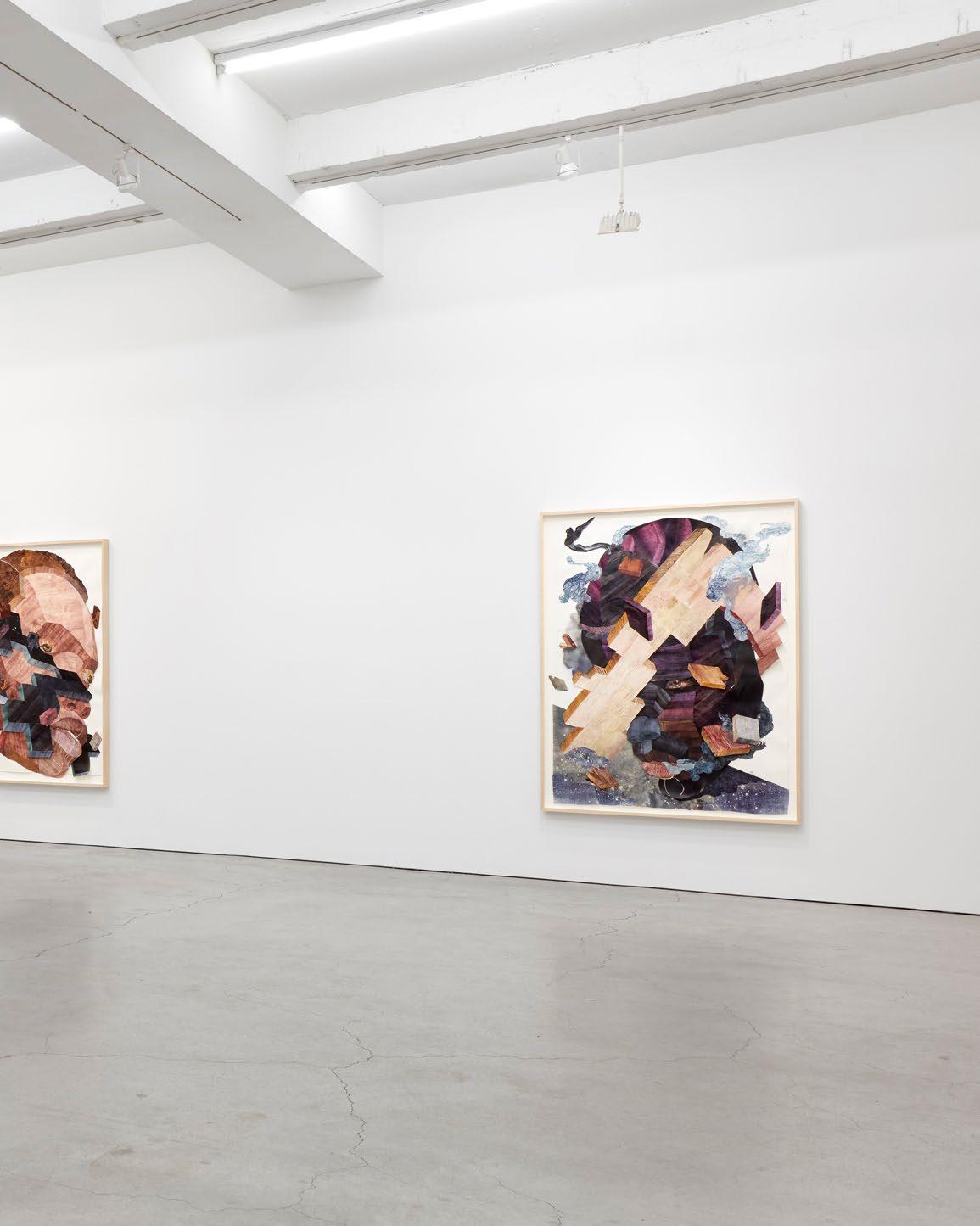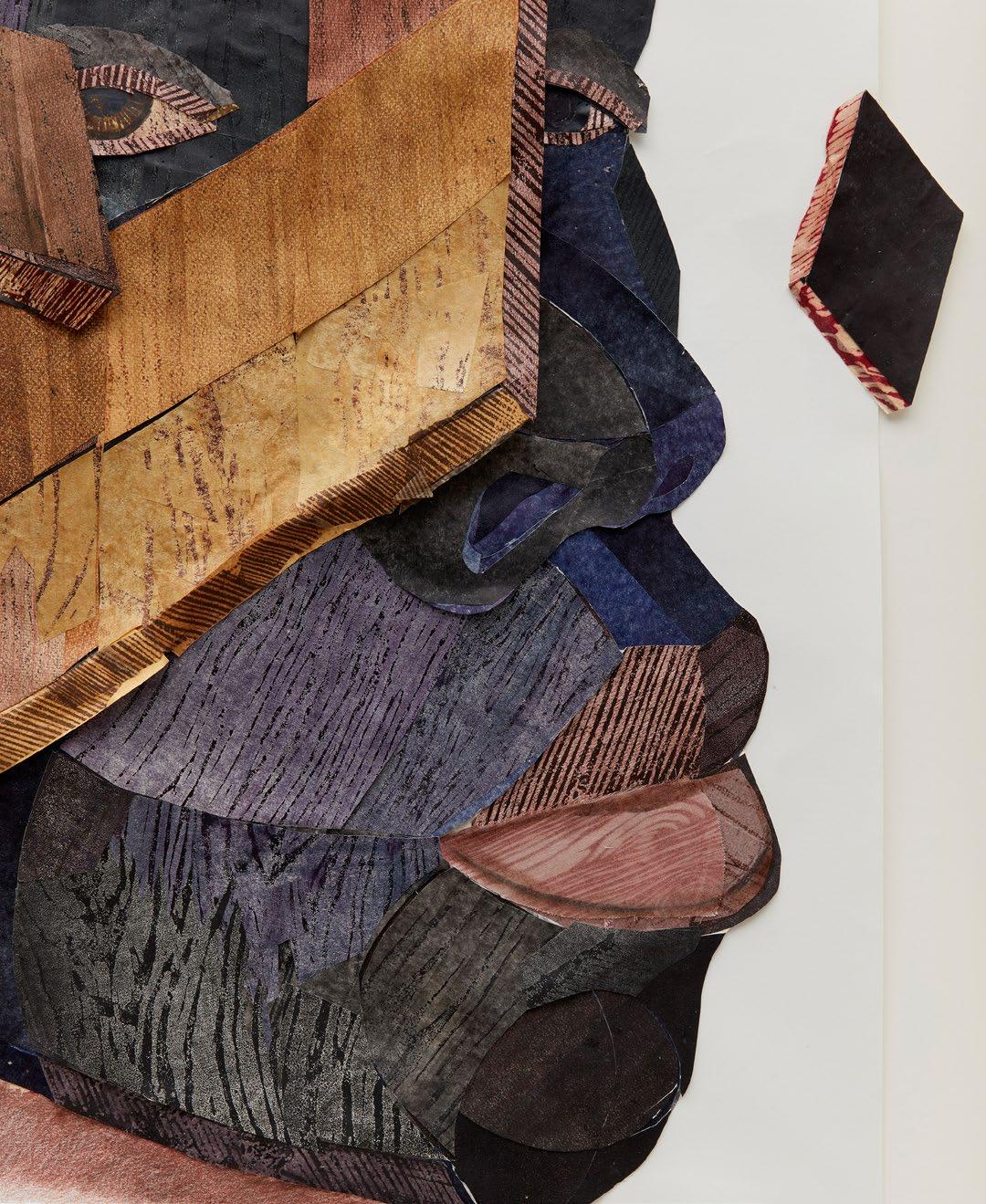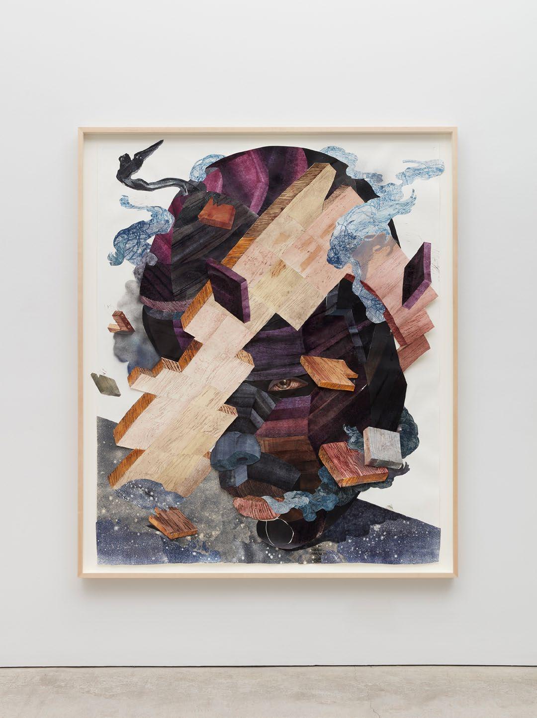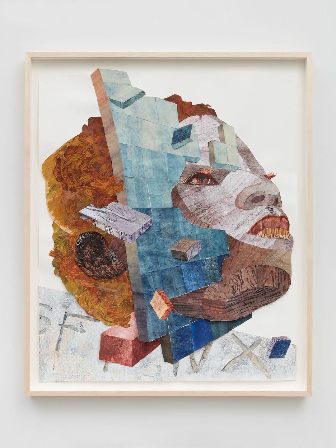 In his practice, Yashua Klos explores how identity—particularly Black identity—is constructed as a means of survival, adaptation, and empowerment. Proposal for a Monument features a selection of recent large-scale woodblock print collages. In this body of work, Klos revisits imagery he first began exploring in 2015, of dimensional portrait busts intersected by grids, planes, wood, and concrete blocks. The integration of building materials and architectural elements into the collages alludes to the built environment, and specifically to the urban area of Klos’s hometown, Chicago—a city indelibly shaped by its signature street grid as well as by legacies of segregation and housing discrimination. The anonymized subjects of Klos’s collages are placed in constant negotiation with the material symbols of these unjust systems, entangled within their wreckage yet at times breaking through or reclaiming it as scaffolding to support the construction of something new.