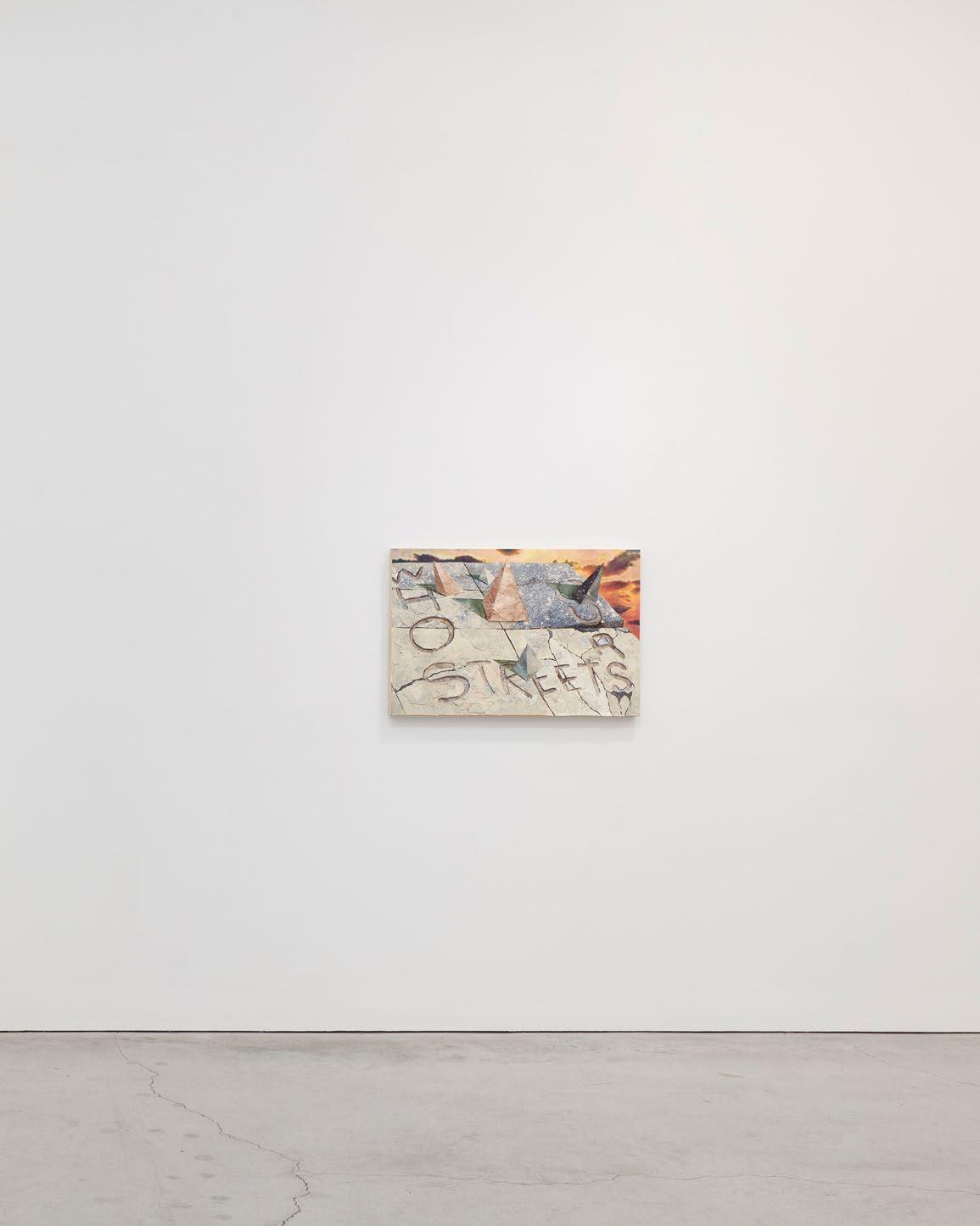 Proposal for a Monument also presents several “sidewalk” collages depicting text or imagery etched onto slabs of pavement. Klos’s representation of the sidewalk links the open, communal function of pedestrian pathways to the optically democratic structure of the grid, in which viewers can enter at any point. Similarly, any person can leave their own permanent mark on the cement sidewalk: a defiant gesture, and a record of existence against an uncertain future. In Golden Ratio (2026), a Fibonacci spiral loops over shards of cracked concrete, a modern urban echo of the ancient Nazca geoglyphs in Peru. The geometric forms adorning Who’s Streets? (2026) reference the monumental pyramids at Giza, while the titular words transcribe a popular call-andresponse slogan—heard during the 2020 protests following the murder of George Floyd in Minneapolis—into a lasting reclamation of space and dignity.
