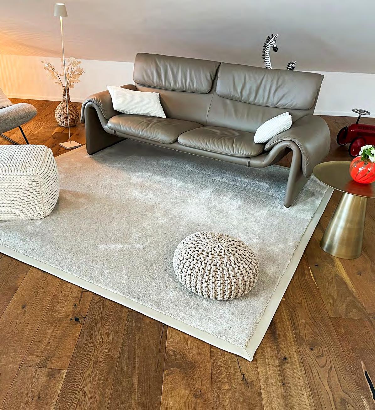 Das Herz jedes Bordürenteppichs bildet ein von Ihnen gewählter Textilbelag. Ob aus unserer umfangreichen Kollektion oder jedem beliebigen Sortiment. Sie bestimmen Mass und Kombination. Als krönender Abschluss wählen Sie eine tolle Bordüre aus unserem umfangreichen Angebot. Wir bieten Zuschnitt, Veredelung und natürlich unser Know-How bezüglich Qualität und Verarbeitung. Individuelle Masse und Formen sind kein Hindernis. Senden Sie uns Ihre Skizze zu. Wir fertigen für Sie Ihr Unikat in fast jeder beliebigen Form. Lassen Sie Ihrer Fantasie freien Lauf. Wir verarbeiten auch Fremdmaterial.