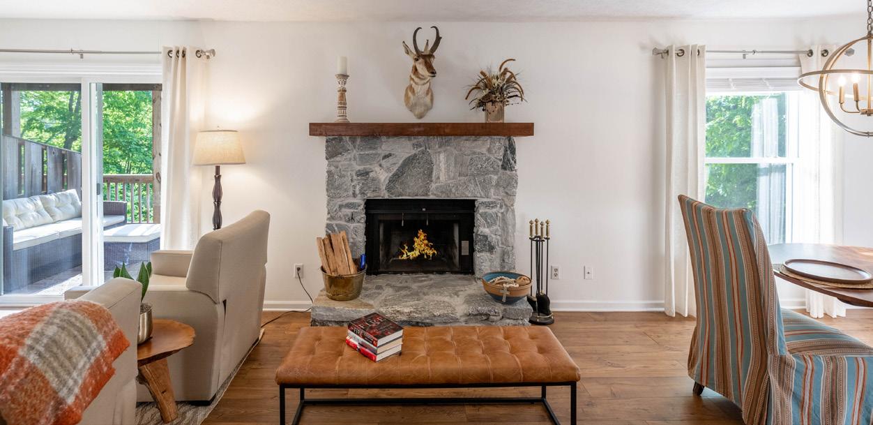 The open living space boasts high ceilings and a stone fireplace, creating an airy and spacious atmosphere. Bountiful windows throughout the cottage allow natural light to fill the rooms, offering picturesque views of the lake and surrounding nature.