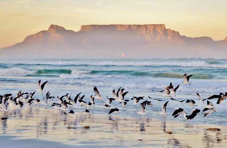 Vögel im Schatten des Tafelbergs in der Morgendämmerung; Kapstadt, Südafrika