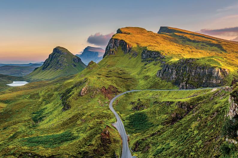 Sonnenuntergang im Quiraing-Gebirge auf der Isle of Skye, schottisches Hochland