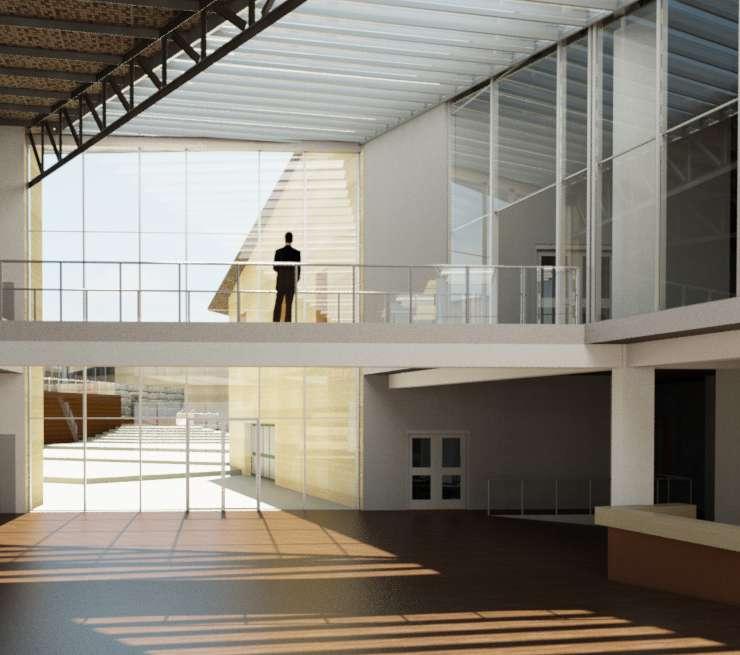 El espacio principal de ingreso dispone de un techo vidriado que permite al visitante ver el cielo en contraste con los volúmenes cerrados, brindando también una vinculación visual hacia el espacio de Cuarto del Rescate.