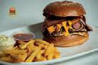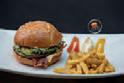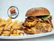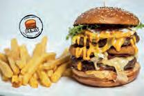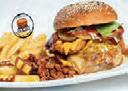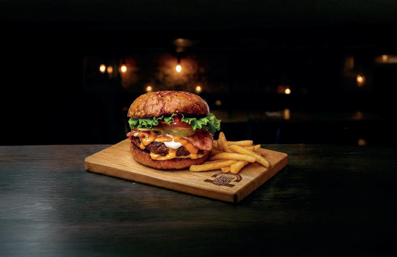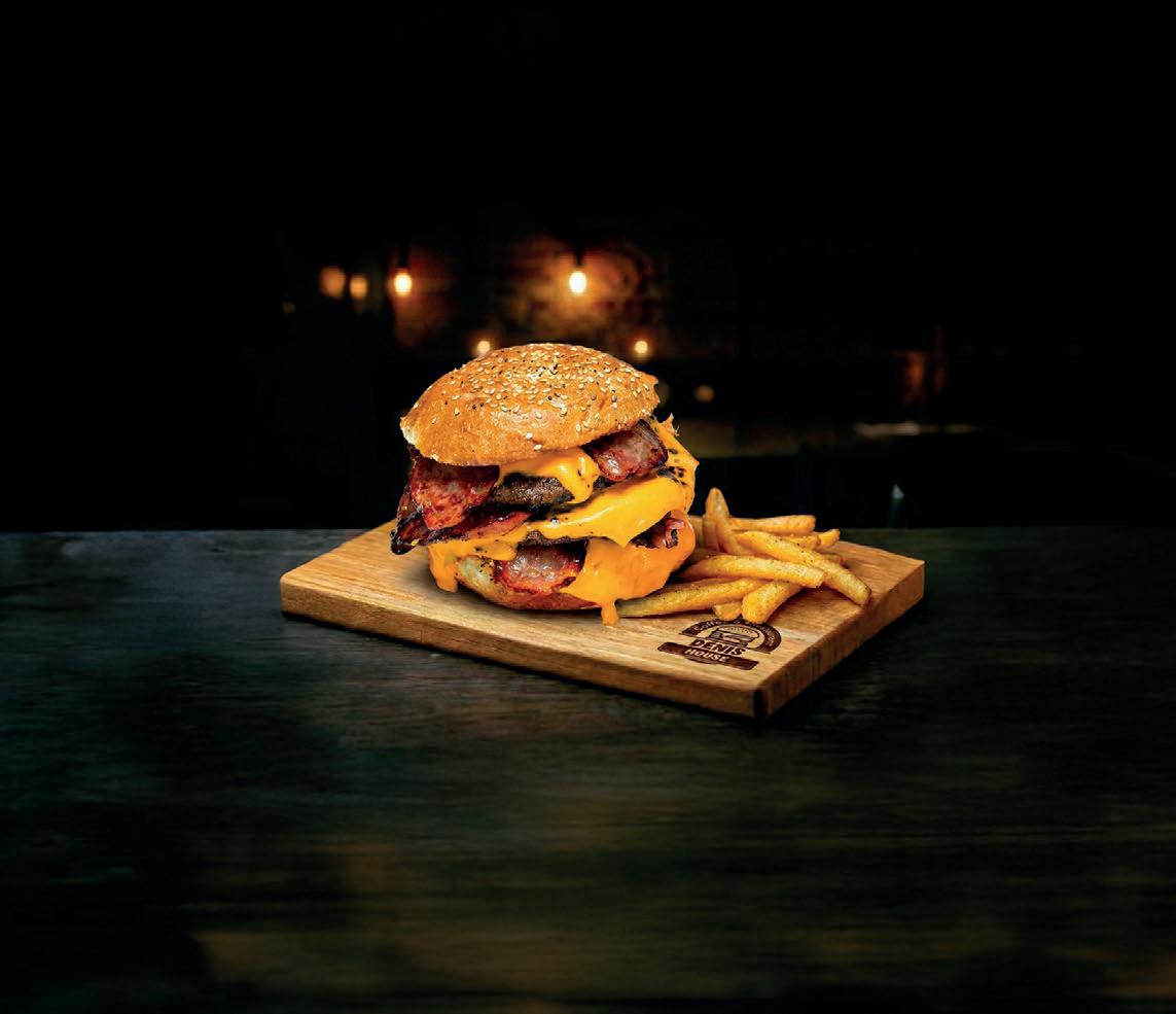 Pan artesanal, salsa pizza, carne res picada arreglada, jamón, tocineta, queso frito, salsa queso, cebolla (con mostaza), pepinillo, tomate, lechuga, salsa y mayonesa.