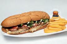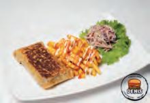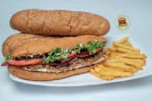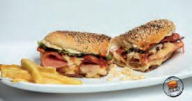 Pan artesanal, margarina, salsa pizza, queso frito, tocineta, pollo a la plancha, mostaza miel, salsa de tomate, mayonesa, tomate y lechuga.