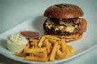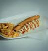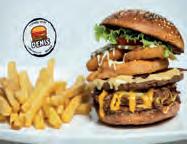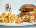 Pan, margarina, salsa pizza, queso frito, jamón, tocineta, aderezo especial de la casa, costra de queso mozzarella rellena con ocho camarones sazonados, tres aros de cebolla, salsa de queso, pepinillos, tomate, lechuga, mayonesa.