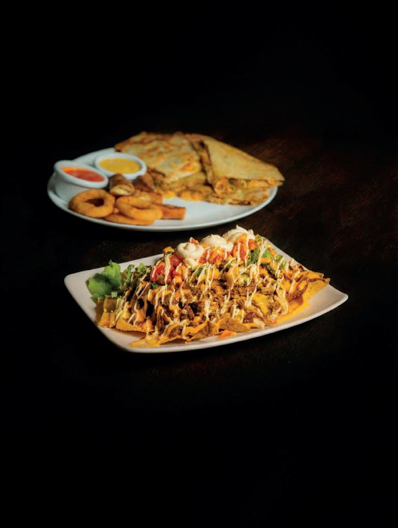 10 aros de cebolla, 400 gr de papas fritas, 5 tacos de queso (tortilla de harina), 5 tacos de carne (tortilla de maíz), 5 tacos de pollo (tortilla de harina), 5 tacos de cerdo (tortilla de maíz) + 4 salsas a elegir.