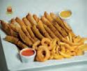 10 aros de cebolla, 400 gr de papas fritas, zanahoria, apio, manzana + 3 salsas a elegir.