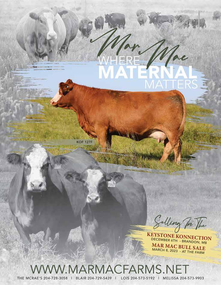 FREEDOM REPUTATION OUTLOOK NOW $60 was $75 NOW $49 was $70 NOW $60 was $75 SHAMROCK NOW $60 was $75 30% OFF 20% OFF 30% OFF 20% OFF MAVERICK WALK THIS WAY BETTS TRAILBLAZER NOW $60 was $100 NOW 45 was $75 NOW $45 was $60 NOW $45 was $60 25% OFF 25% OFF 40% OFF 40% OFF NOW $60 was $75 TOP TIER SLIDER NOW $60 was $75 NOW $45 was $60 20% OFF 20% OFF 25% OFF SUPERCHARGED NOW $70 was $100 30% OFF Supplying Canada’s most progressive genetics to the beef industry Fall Semen Sale special ends December 31, 2022. Subject to availability. Minimum order of 10 units and must be paid by Dec. 31 or within 30 days of invoice in order to receive sale price. Sale prices apply in Canada only and are available only directly through Canadian Sires. fall semen Sale Check out our online store and order today to ensure availability!or email us at bohrsonoffice@gmail.com www.CanadianSires.com 2-SIMMENTAL FOCUS