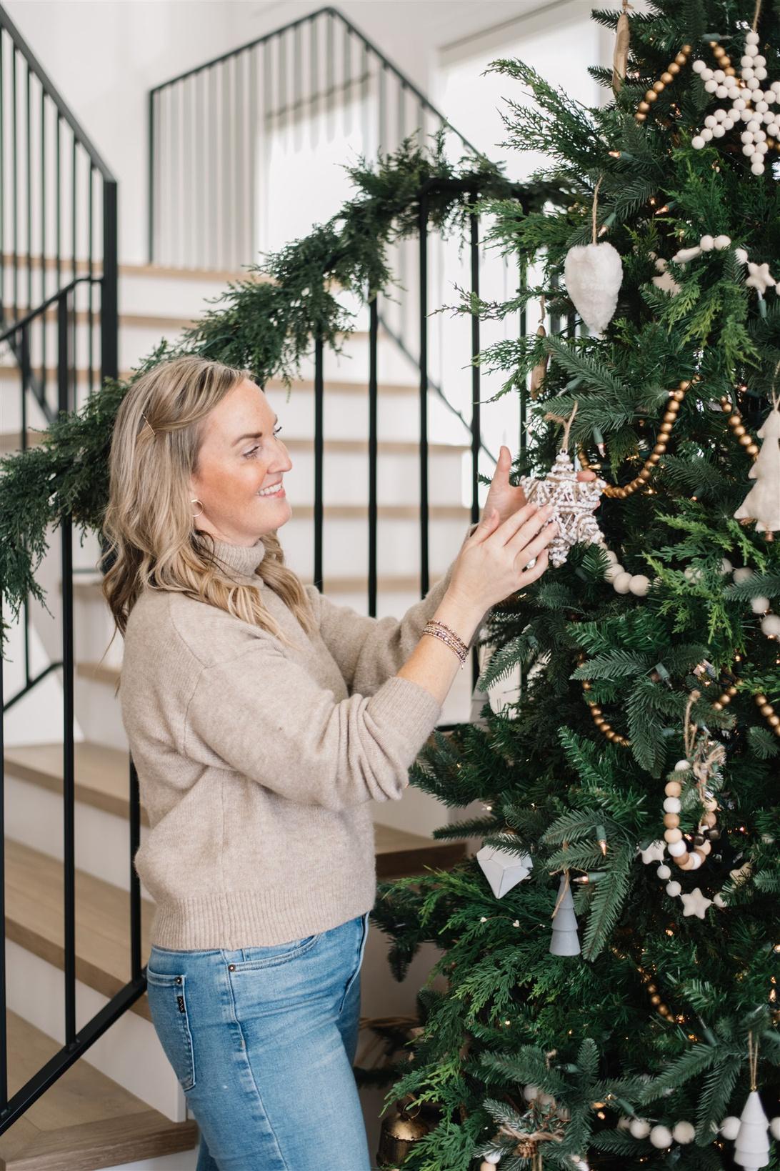 Once your lights are in place, start adding additional faux greenery or garlands to add texture and variant colour This is also a great trick to fill any big gaps in your tree and make it look extra full!