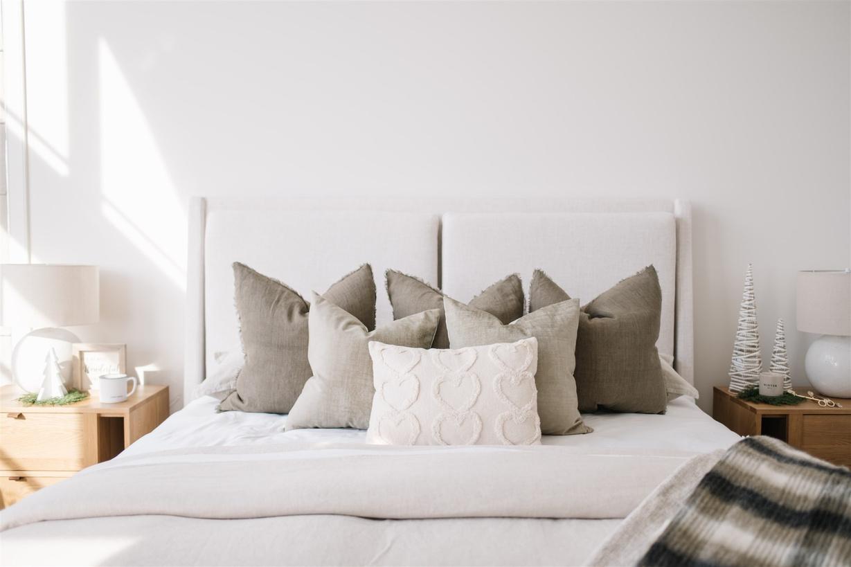 SHOP THE LOOKBedding 1) Linen Duvet Cover - Natural (Starting at $295) | 2) Linen Duvet Cover - White (Starting at $295) 3) Linen Pillow Sham - Natural (Starting at $34) | 4) Linen Pillow Sham - White (Starting at $34) 5) Cove Throw - Shadow ($126) | 6) Layna Linen Pillow - Mink ($148) | 7) Cove Throw - Silica ($126) 8) Love Pillow ($42) | 9) The Arrow Throw - Pewter ($146) | 10) Freya Pillow - Oatmeal ($76) (1) (2) (5) (6) (7) (8) (9) (10) (3) (4)