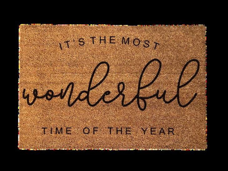 4 FAUX MIXED CEDAR WREATH $388 WOVEN WATER HYACINTH BASKET $168 PINECONE EUCALYPTUS WREATH A FESTIVE ENTRANCE EXTERIOR $58 MOST WONDERFUL DOORMAT $78 FROSTED MISTLETOE WREATH $72 HAPPY HOLIDAYS DOORMAT $78 OLIVES EVERGREEN WREATH $158 PAPER MACHE A FRAME HOUSES $62 $76 RAYNE RUG STARTING AT $88
