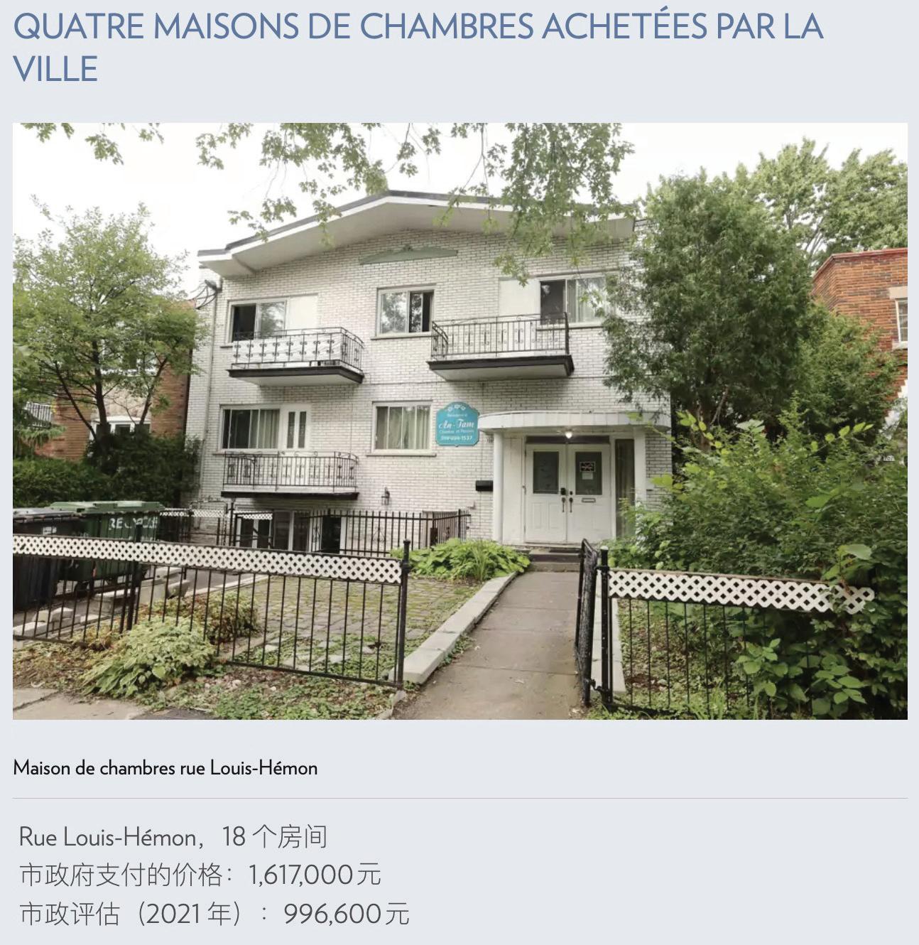 在另外一个案例中,蒙特利尔市政府为购买位于 Villeray区Louis-Hémon街的一栋18居室房屋支付了 161.7万加元,而这栋房屋的市政估价为99.7万加元。 2019年,这栋房屋以76.26万加元的价格易手。