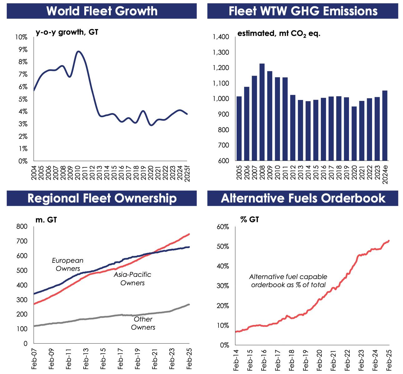 average difference in growth between ship demand and cargo volumes over the period 2020-2024, has seen ship demand increase by about double the rate of cargo growth on average across the tanker, dry bulk, container, and LNG sectors compared with the period 20102019.