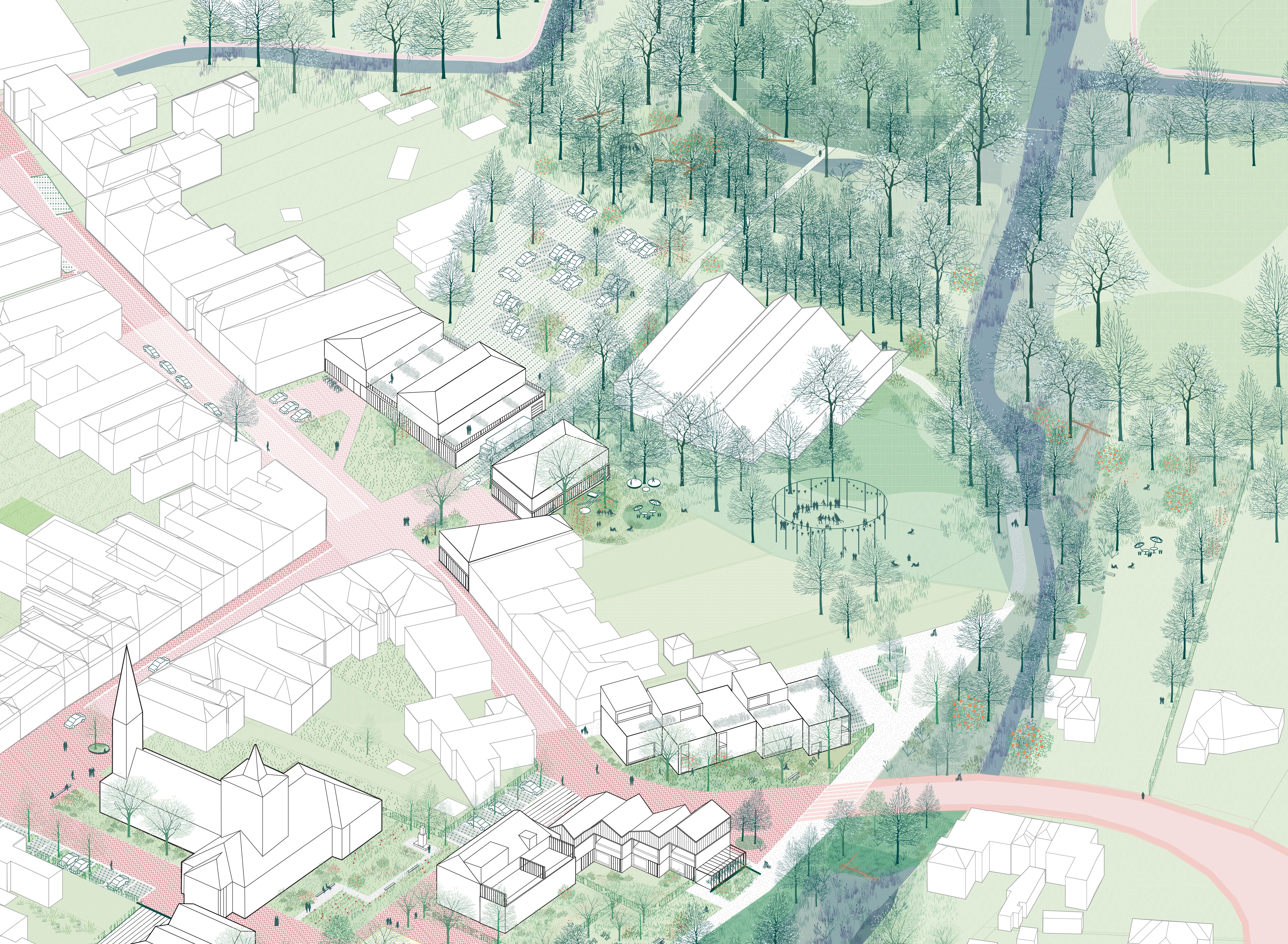 De parochiezaal wordt afgebroken. Daar komt een groene kerktuin. Door de oude Chiro-en KLJ-gebouwen ook af te breken komt er ruimte voor een nieuw dorpsplein met • groene ruimte om elkaar te ontmoeten • petanque • een gebouw voor de verenigingen • horeca met terras • bredeschoolgebouw vlakbij buurtpark en speeltuin • enkele parkeerplaatsen aan de rand
