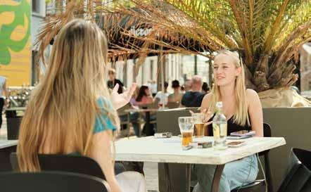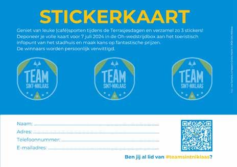 Naast heerlijke hapjes en drankjes op de talrijke terrassen is er ook ruimte voor sport en spel. Van volkspelen en petanque tot fietsen op rollen: een terrasje doen in SintNiklaas was nog nooit zo plezant. Al deze terrasjes zijn gebundeld op een gloednieuwe terraskaart. Neem een exemplaartje mee in jouw favoriete horecazaak. Oh ja: bezoek zeker drie of meer terrasjes om kans te maken op leuke prijzen! (zie pg 16)