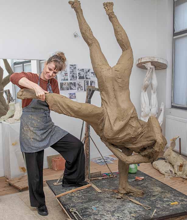 Beeldhouwster Edith Ronse aan het werk in haar atelier: “Ik kies vaak voor spanning en beweging in mijn beelden.”