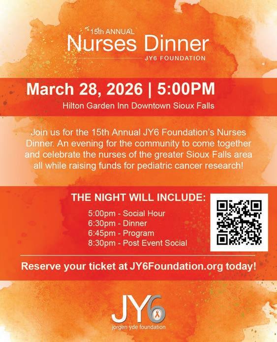 This year’s Nurses Dinner is meant to celebrate nurses and is open to the public. For any questions call 605.274.3388 or email: events@jy6foundation.org. n