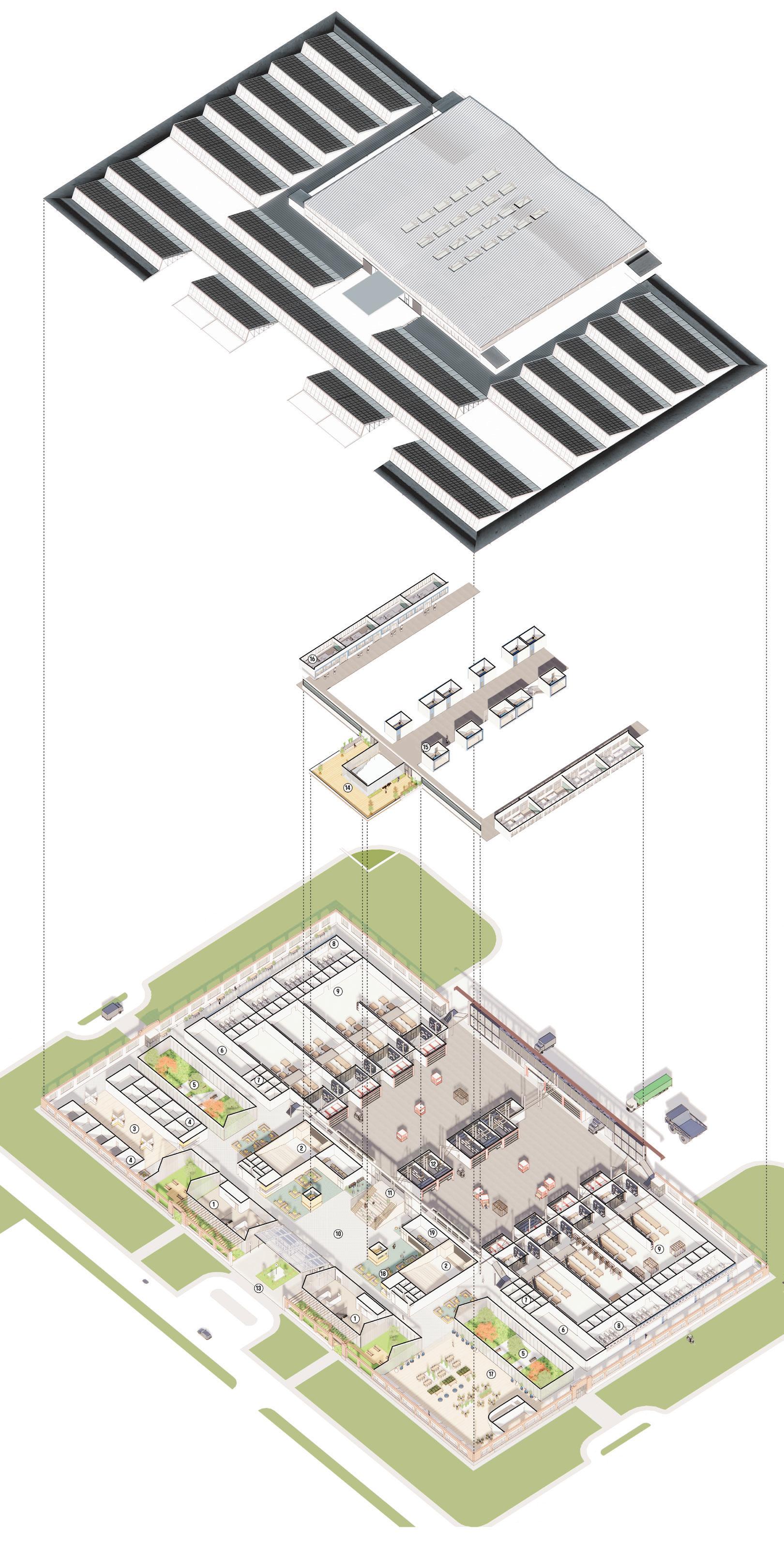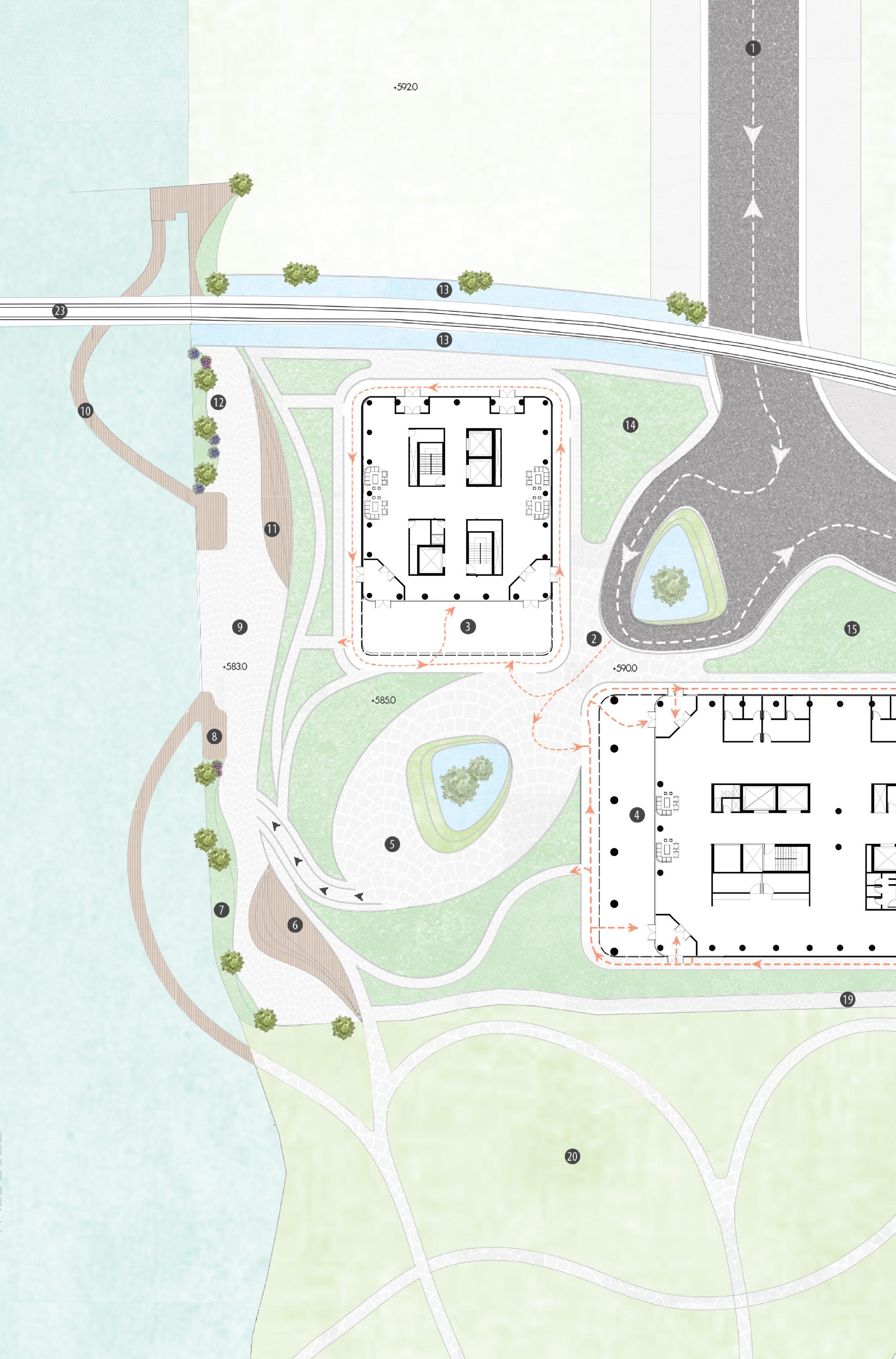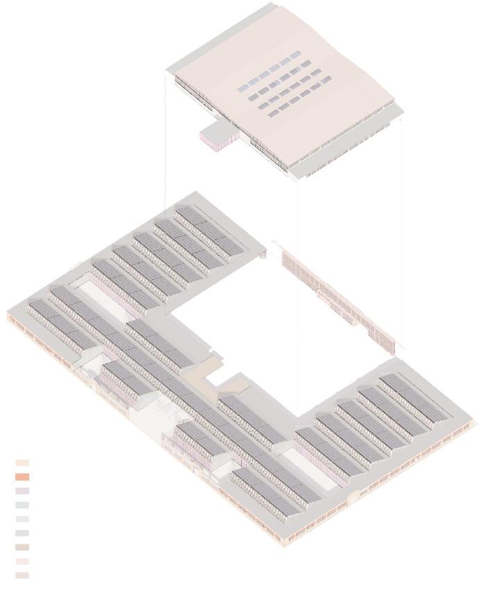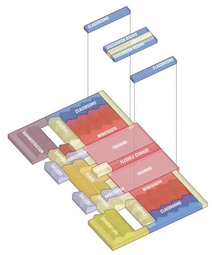+AXONOMETRIC EXPLODE MEZZANINELEVEL GROUNDLEVEL LEGEND 1 GALLERY 2 AUDITORIUM 3 OPEN OFFICE 4 FACULTY ROOMS 5 COURTYARD 6 MECHANICAL ROOM 7 UTILITIES 8 CLASSROOM 9 WORKSHOP 10 INTERIOR PLAZA 11 STAIRS 12 FLEXIBLE STORAGE 13 MAIN ENTRANCE 14 OUTDOOR SPACE 15 DISCUSSION RM 16 STUDIO SPACE 17 STUDENT LIFE 18 CONFERENCE ROOM