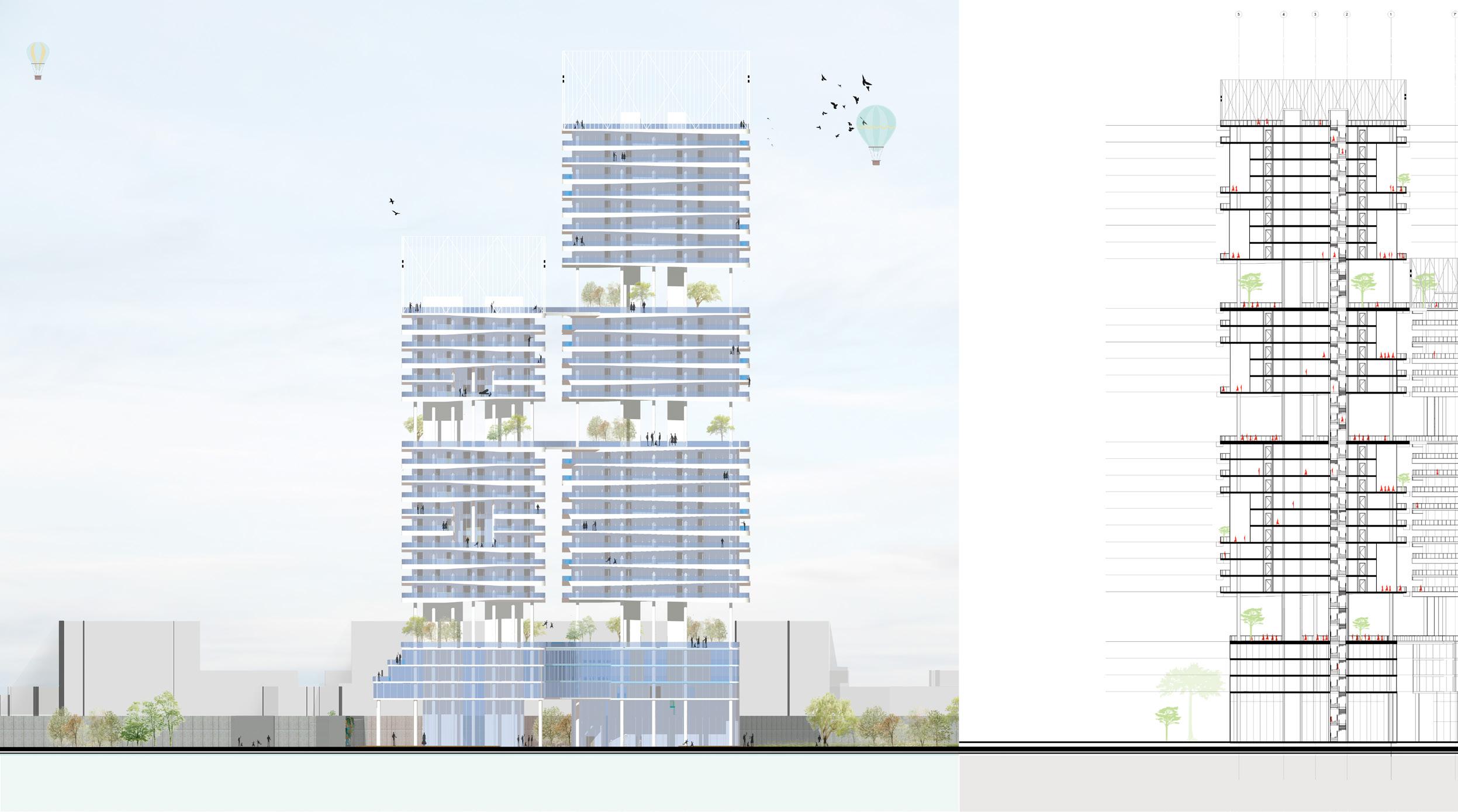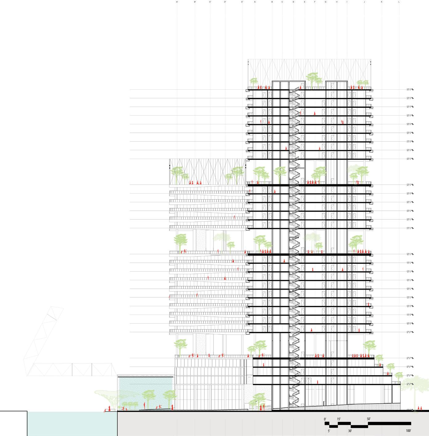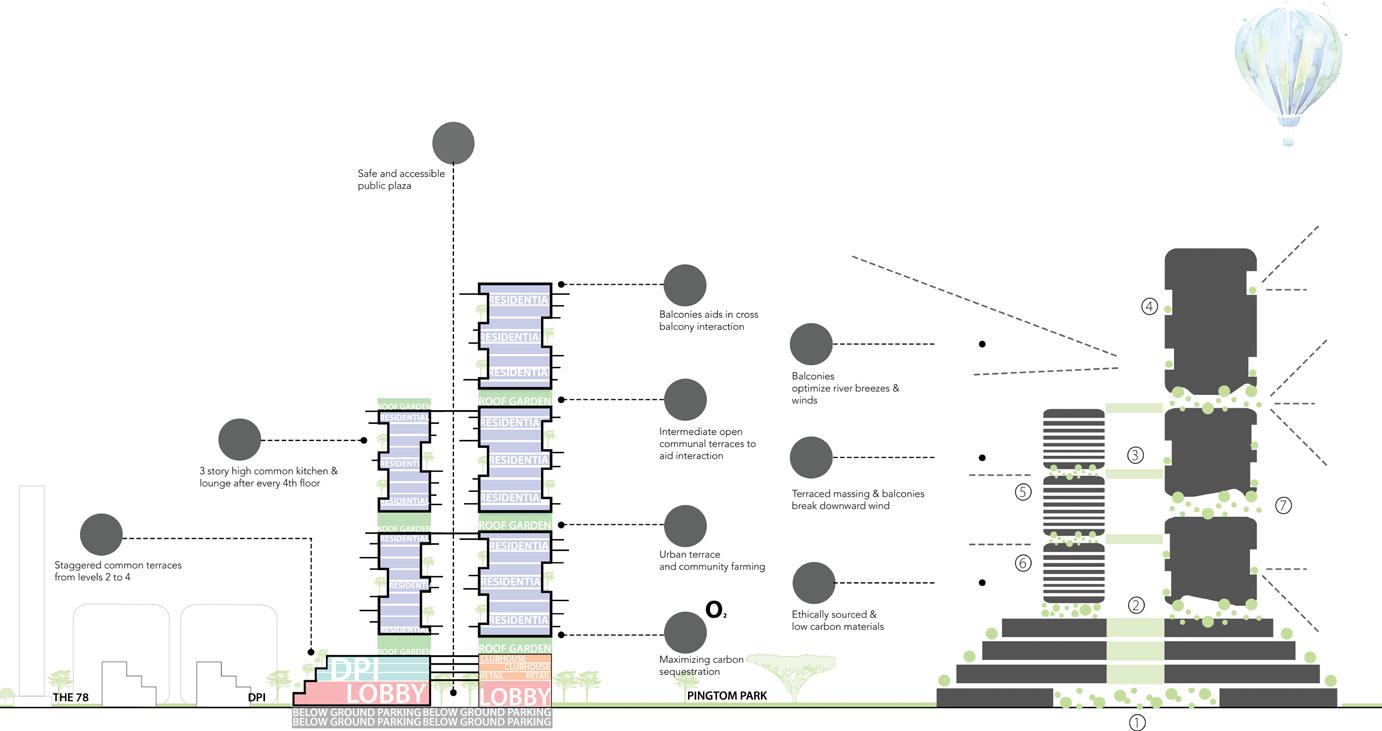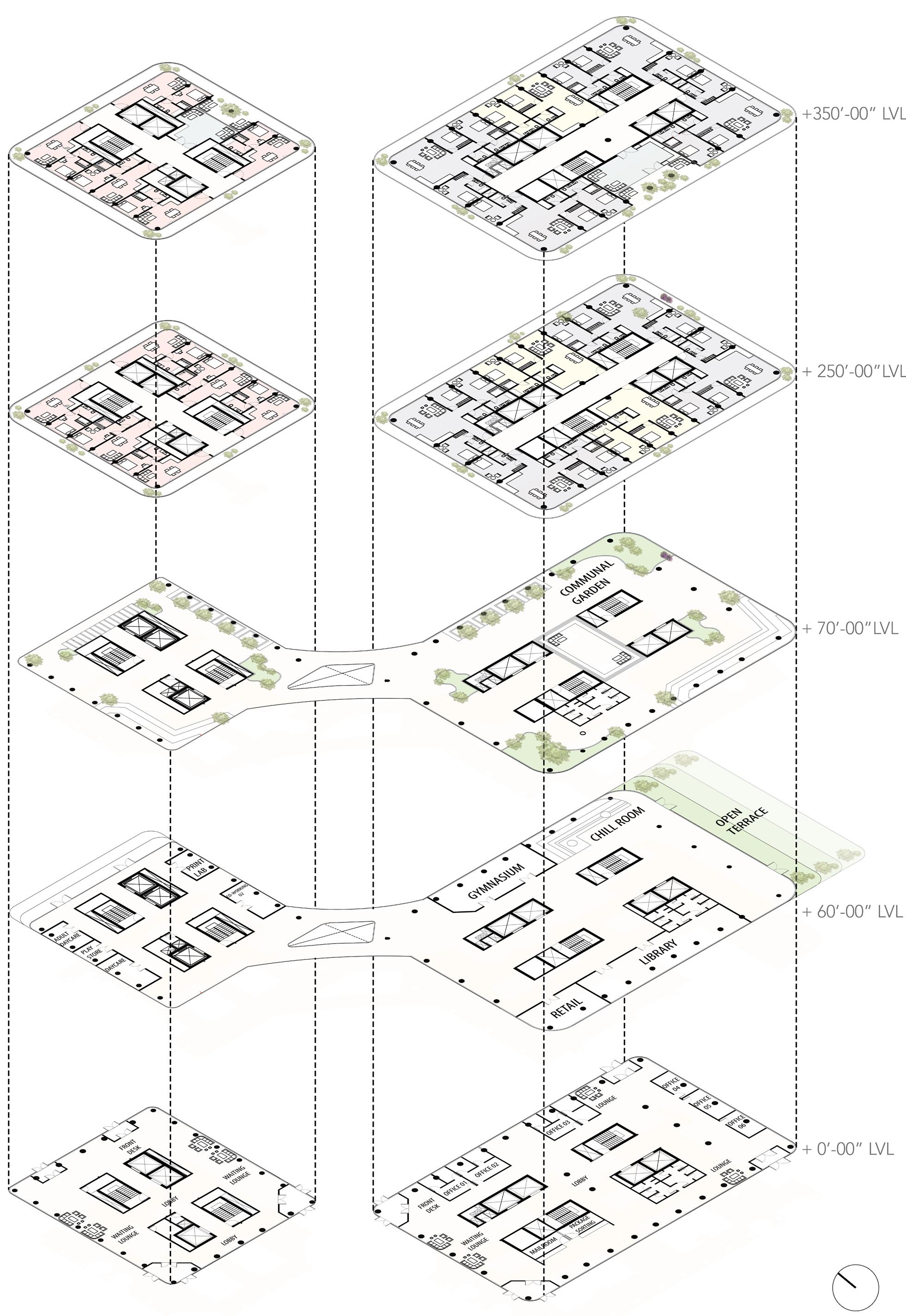 +RESIDENTIAL w/COMMON LOUNGE LEVELS 9, 16, 22 TOWER A 1-BHK UNITS COMMON KITCHEN & LOUNGE TOWER B 2-BHK UNITS 3-BHK UNITS COMMON KITCHEN +RESIDENTIAL LEVELS 6-8, 10-14, TOWER A COMMUNAL TERRACE FARMING CONSERVATORY TOWER B TOILETS SEATING AREA PERGOLA KIOSK +TERRACE LEVELS 5, 15, TOWER A COMMUNAL GARDEN PERGOLA KIOSK SEATING AREA TOWER B COMMUNAL TERRACE CONSERVATORY TOILETS SEATING AREA +PODIUM LEVELS 2-4 TOWER A DPI LABORATORIES CHILL ROOMS ADULT DAYCARE DAYCARE COWORKING SPACES PRINT LAB TOWER B CHILL ROOMS GYMNASIUM LIBRARY RETAIL LAUNDRY PHARMACY TOILETS +FIRST LEVEL LEVEL 1 TOWER A LOBBY FRONT DESK WAITING LOUNGE ADMIN TOWER B LOBBY/ FRONT WAITING LOUNGE ADMIN TOILETS MAIL SORTING PACKAGE SORTING +FLOOR PLANS: +SITE CONTEXT +SITE ANALYSIS +FORM EVOLUTION +PROGRAM DIAGRAM +PATI DIAGRAMS SCALE: 1/16” = 1’-00 13 +SECTION AA’ SCALE: 1/32” = 1’-00