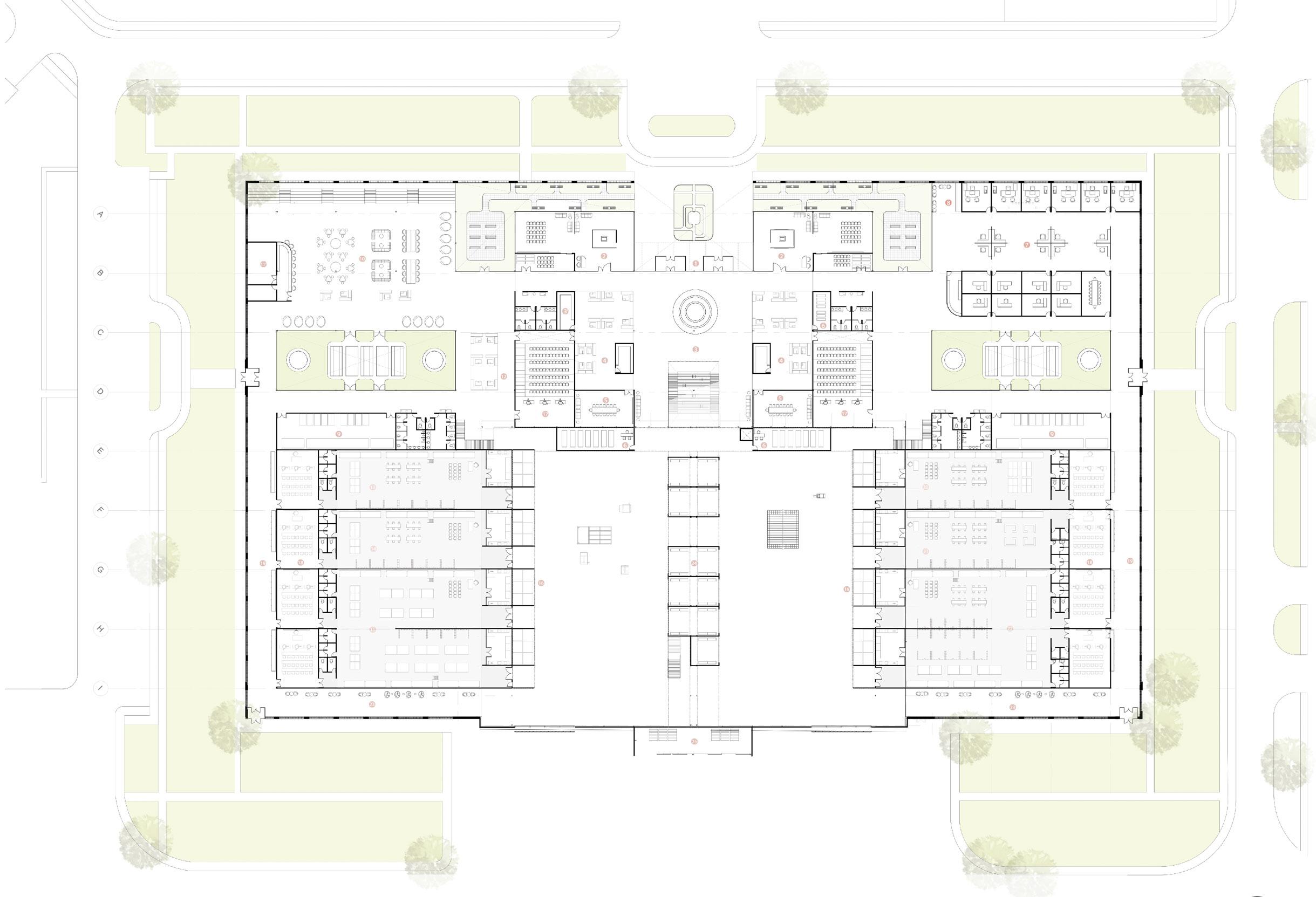 +GROUND FLOOR PLAN +VIEWS SCALE 1/32”= 1’-00 LEGEND ENTRY GALLERY PLAZA/FRONT DESK WAITING LOUNGE CONFERENCE ROOM SUPERVISOR+STORAGE ADMIN MECHANICAL ROOM STUDENT LIVING CAFE+KITCHEN&STORAGE STUDENT ZONE 1 PLUMBING WORKSHOP HVAC WORKSHOP CARPENTRY WORSHOP LECTURE HALL CLASSROOMS LOCKER LOUNGE ELECTRICAL WORSHOP MASONRY WORKSHOP WELDING WORKSHOP STUDENT ZONE 2 18