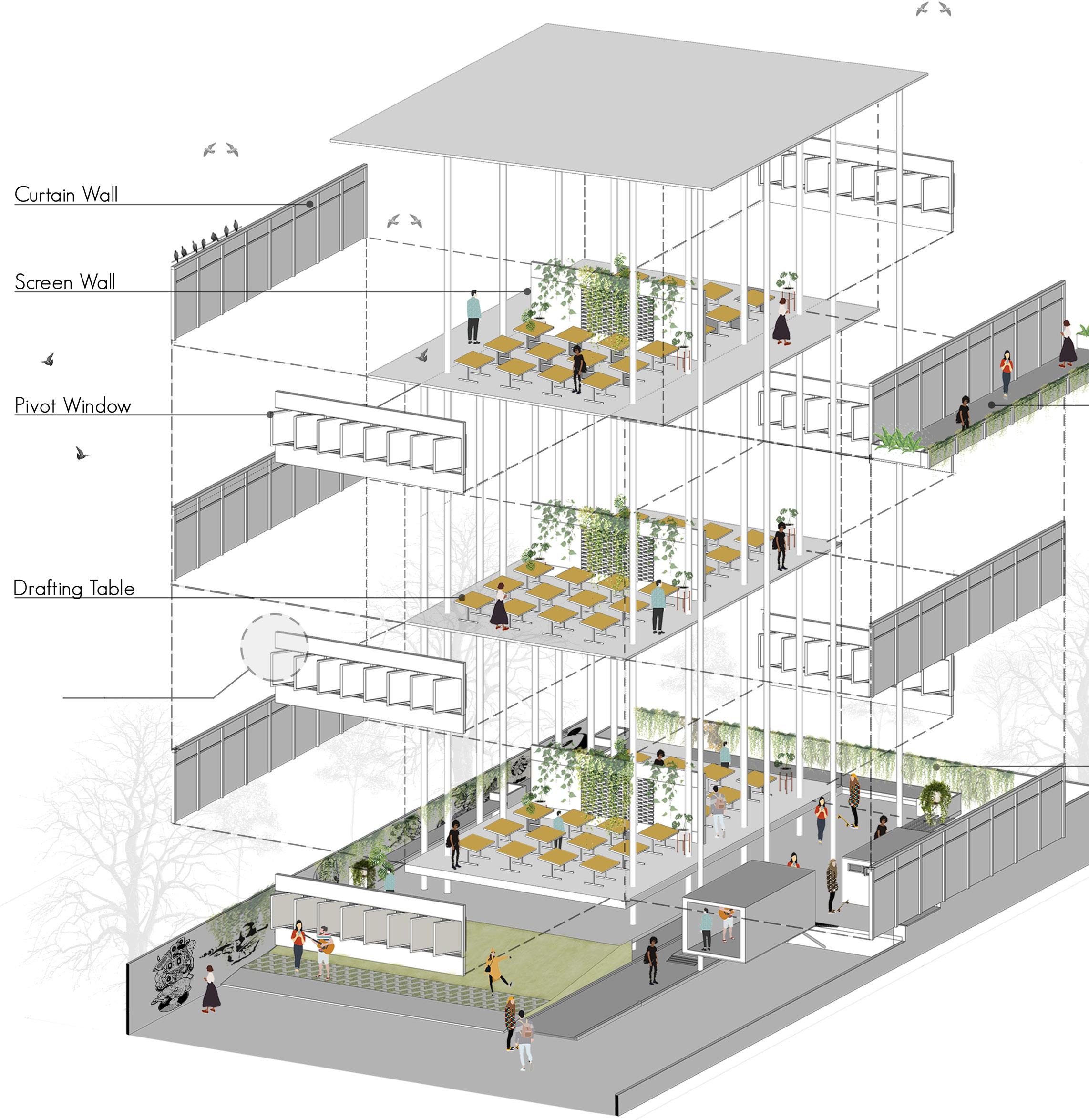 The programme for the project as a part of third year studio design project is an Architecture Campus Design that rethinks the spaces architecture schools currenlty boast. Existing on turbulent landscape the blocks attempt to create a sequence engendering several shards that add up to create a stunning scene. The Site has tepid contours. The uneven land is levelled by Cut and fill method. The cut earth from the steeper part is used to lower level part of the land creating a solid compacted base for each block.
