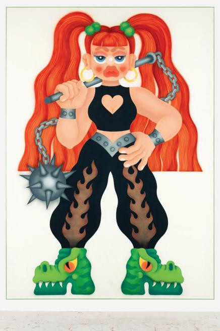 En la monumentalidad de las creaciones de De Juan presenciamos reminiscencias del graffiti, que, de la misma manera, también nos remiten a los inicios del tiempo: plasmados en la pared, como ya ocurriera en los albores del arte en las cuevas paleolíticas: la pintura vuelve a su más recóndito origen, a través de la recurrencia del propio gesto pictórico3. Tales pinceladas creadas por la artista mallorquina, a veces imposibles de aprehender por la visión actual, moldean unas imágenes capaces de transmitir el espíritu salvaje de las amazonas, aquel que la reina Pentesilea representaba, y al que Webster Wilde relaciona con el Palacio de Knossos y la estatuilla de Our Lady Of Sports4. Unos trabajos colosales, que manifiestan un imaginario basado en una naturaleza impenetrable y naif, capaces de soportar el peso de la historia y traer al presente a unas amazonas futuristas, que explotan la idea de belleza desde el deseo, la quietud y la fuerza. Guerreras plenas de rasgos que nos remiten a lo natural, desde una idea alterada de lo primitivo y una paleta cromática pegajosa y contundente. Y, es que, ¿qué nos traen las amazonas, si no es el volver a nuestras más primitivas emociones soterradas?
