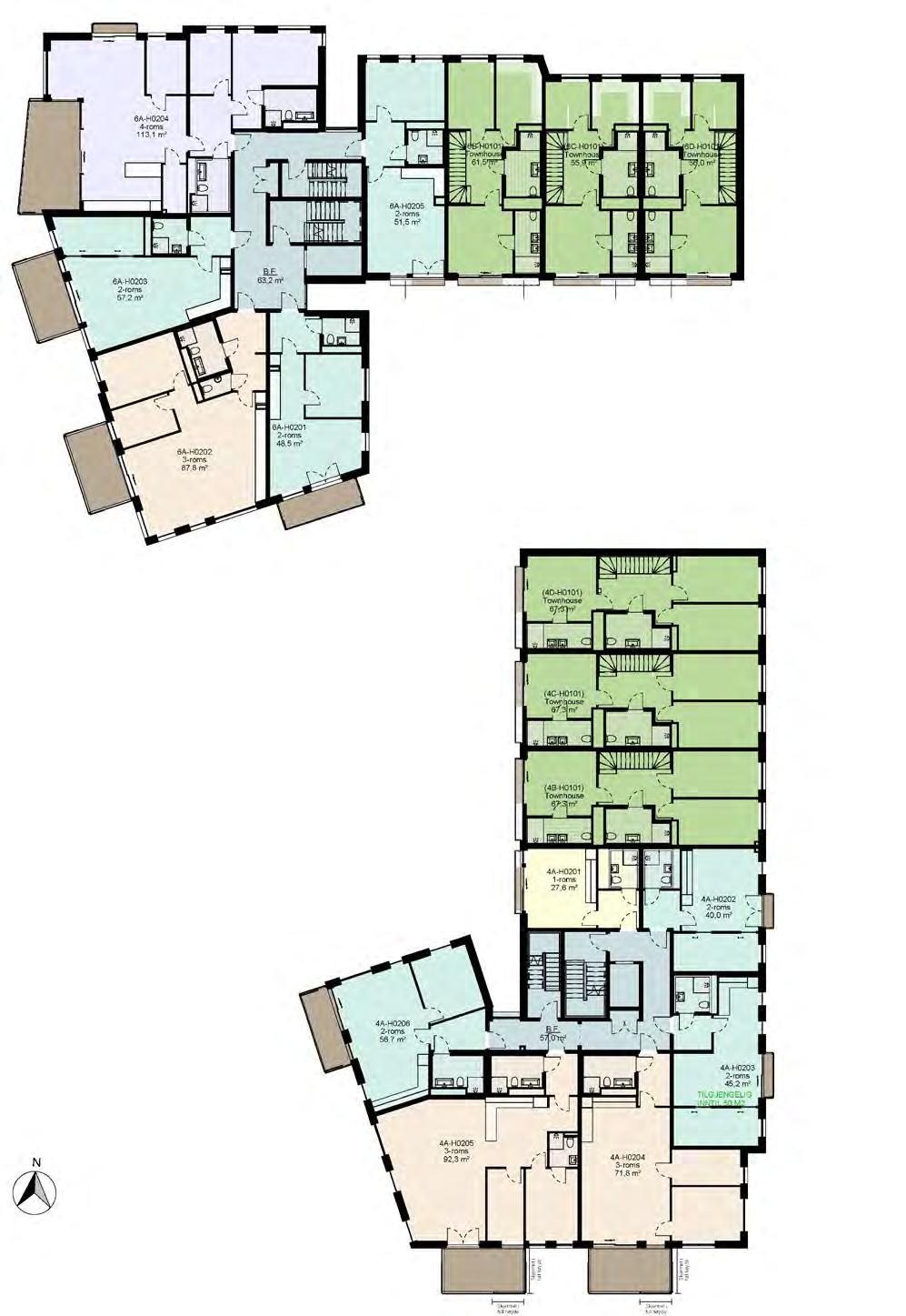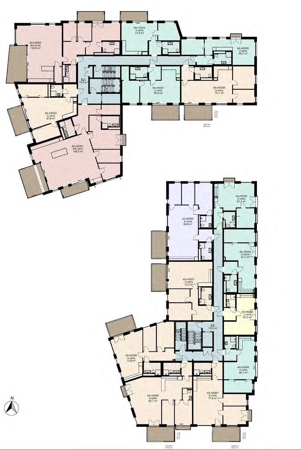 Det er totalt 61 boligenheter fordelt på de to byggene. Med stor variasjon, både i utforming og størrelse, skaper dette noe mer enn bare en ensartet boligblokk. Leilighetene får romslige og grundig gjennomarbeidede løsninger. Store vindusflater, nær sagt fra gulv til tak, gir godt dagslys og utsyn. Kvalitet i materialer og detaljer sikrer det siste lille. Hvert av byggene har trapper og heis som går direkte til parkeringskjeller, boder og felles treningsrom. Det er også avsatt rom for bilvask, hjulskift og sykkelpleie – eller mindre hobbyprosjekter, kanskje? Også i denne sammenheng har variasjon vært et stikkord. Her burde det være mulig å finne et hjem for alle; unge og gamle, barnefamilier og single.
