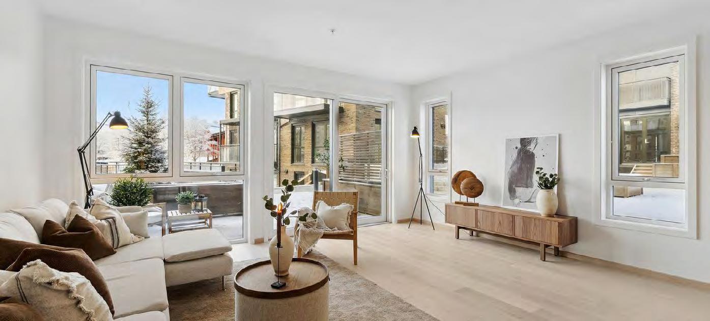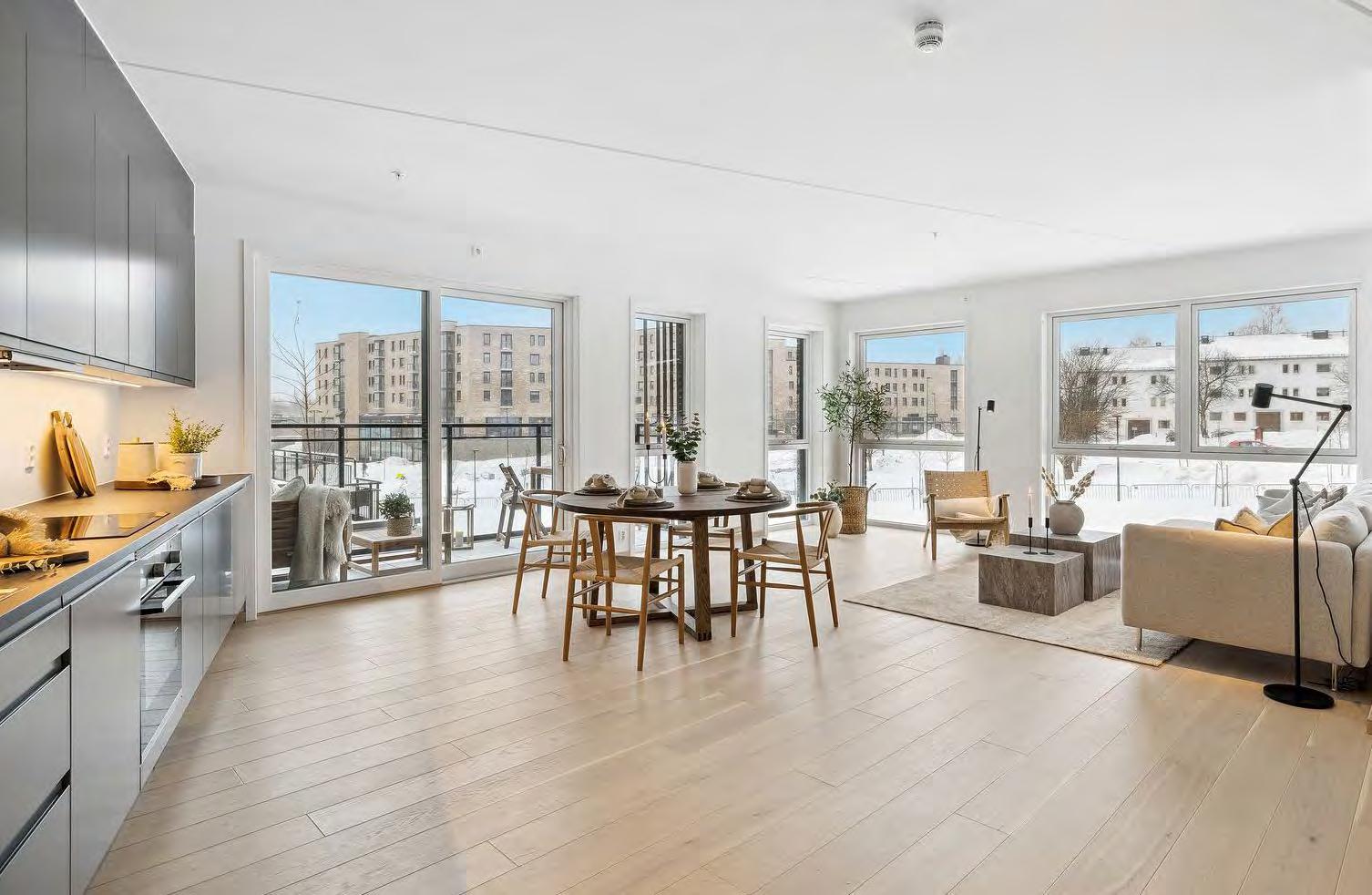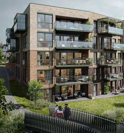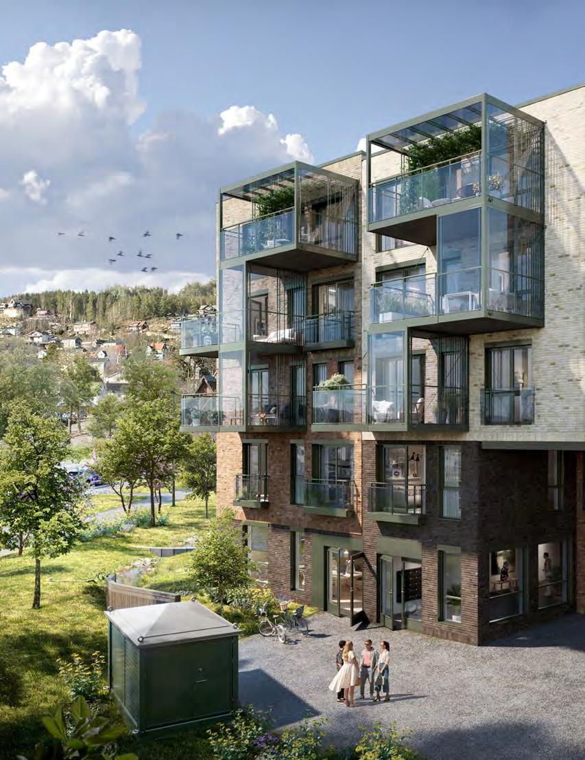 hjem, alle i solid utførelse med smarte planløsninger og store vindusflater, nærmest fra gulv til tak, som slipper lys og energi inn. Boligene er svært varierte og vil bidra til å skape et mangfold av mennesker. Kos deg i solen i både parken og fellesarealene, som på hver sine måter oppmuntrer til godt naboskap og nye vennskap.