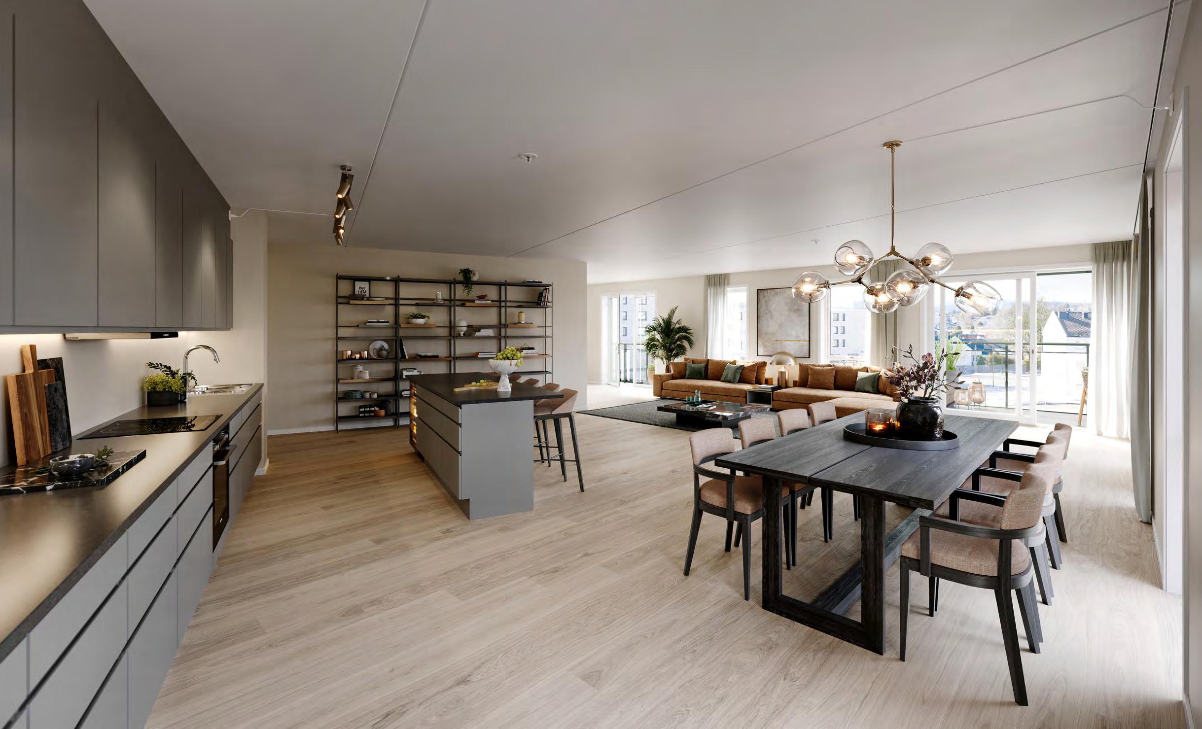 Illustrasjonen viser den flotte stue- og kjøkkenløsningen i leilighet 4A-H0408 på 167 kvm BRA. Lekkert kjøkken, her vist med en av de mulige, kostnadsfrie kjøkkenfrontene i grått. Alle kjøkken leveres fra anerkjent kjøkkenleverandør og med integrerte hvitevarer. I denne leiligheten leveres det vinskap i kjøkkenøy, dog uten vin. Kjøkken leveres i henhold til kjøkkentegninger og avvik fra det viste kjøkkenet kan forekomme.Viste veggfarger avviker fra standardleveransen.