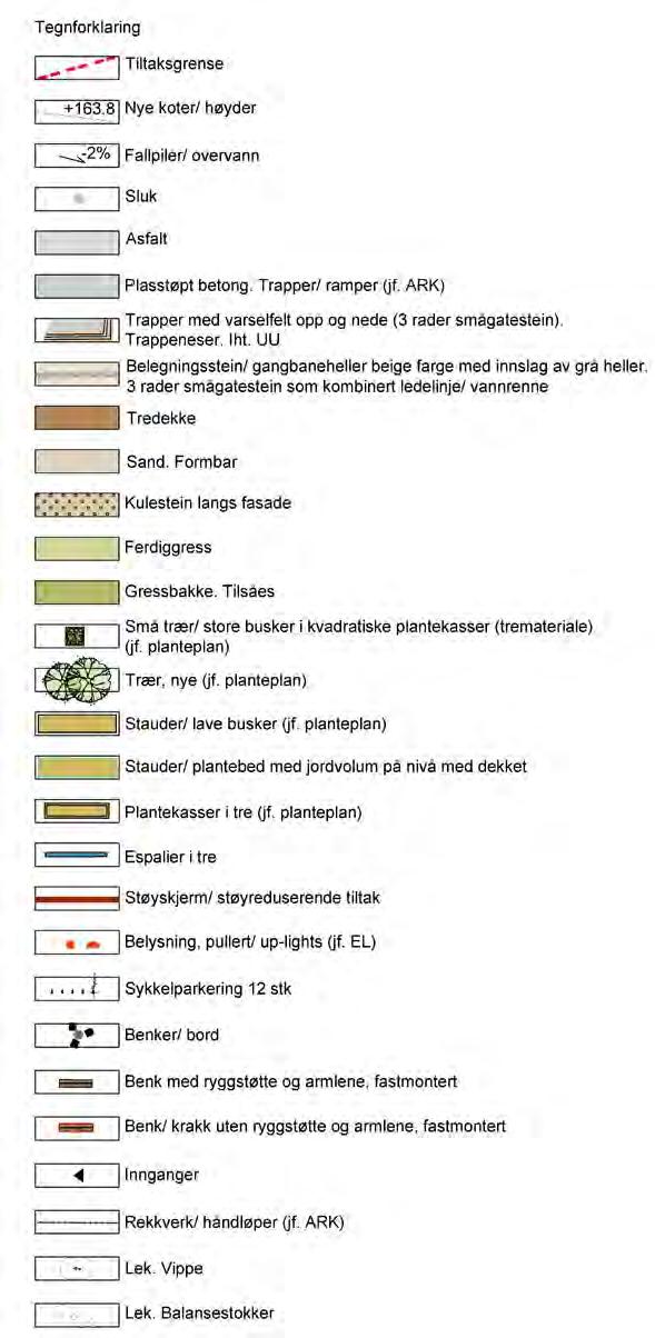 finmasket småskala med variert palett. En oppbrytning av volumet er gjennomført ved å trekke fasadelivet inn og ut, variasjon i teglforband og farge, brutte gesimslinjer, samt balkonger som veksler i fasaden og fremstår som grønne, vegghengte hager.