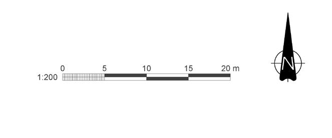 Bebyggelsens skala har ikke for stor kontrast til småhusbebyggelsen i Fjellhamar. For å bryte opp størrelsen er bygningsmassen delt i to volumer, som henholdsvis grenser inn den nordvestre og den sørøstre delen av tomtens byggbare areal. Ved å vinkle volumene unngås lengre fasadestrekk, samtidig som det etableres en diagonal passasje, bestående av to klart definerte uterom, fra sørvest til nordøst.