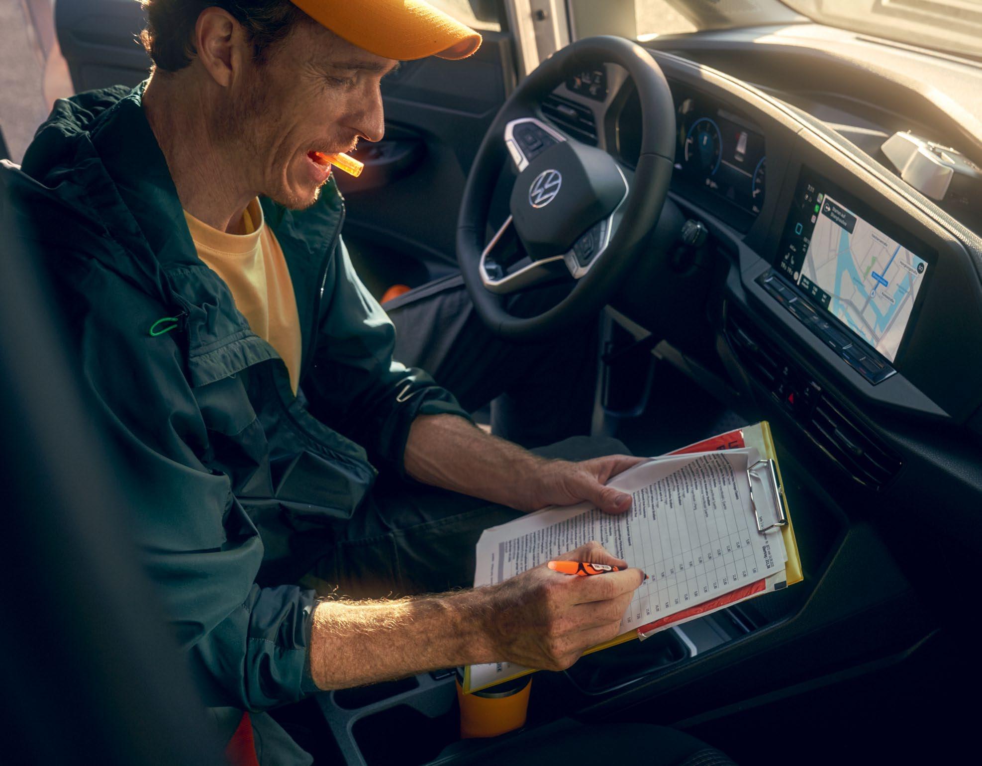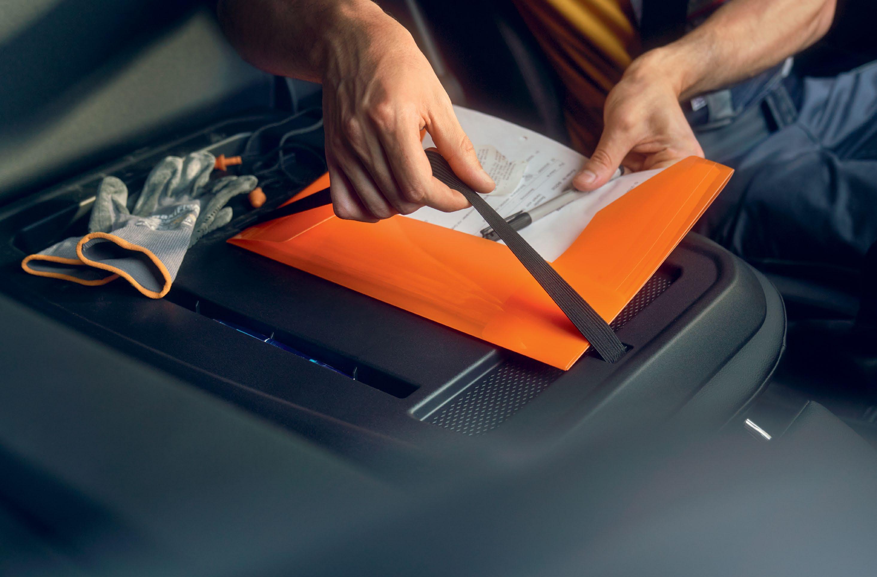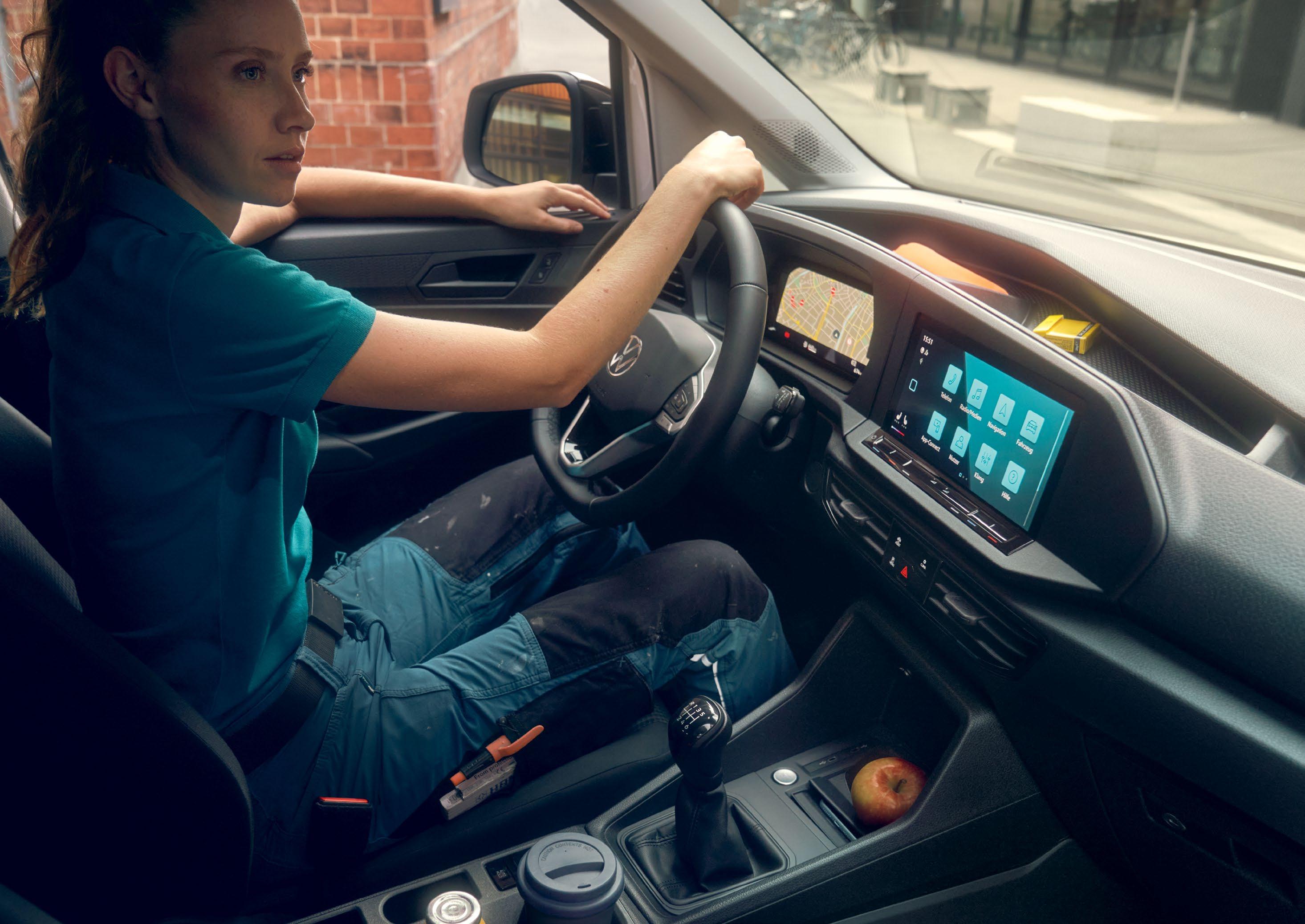 Få en godt organisert og mer avslappet arbeidshverdag. Den gjennomtenkte førerplassen i Volkswagen Caddy Cargo har praktiske detaljer som det brede oppbevaringsrommet.