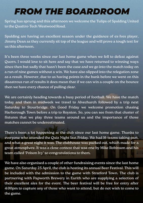 Today’s opponents have no doubt been one of the more impressive teams in Southern League Premier Division Central this season, having occupied one of the top two spots in the league for the majority of the campaign. The Tulips narrowly missed out on a playoff spot last in the 2024/25 season having finished just two points behind 5 placed Harborough Town. Under the stewardship of manager Jimmy Dean, Spalding have made a good go of putting that right, having stormed to 76 points from 35 games. Safe to say, the Lincolnshire-based outfit are serious about leaving nothing to chance this time around. Despite their formidable league form, Ives are one of the five sides to taste victory against Dean’s men this season, with a stoppage time winner from Michael Richens sealing a remarkable 3-2 away win for manager Ricky Marheineke’s men back in November. th