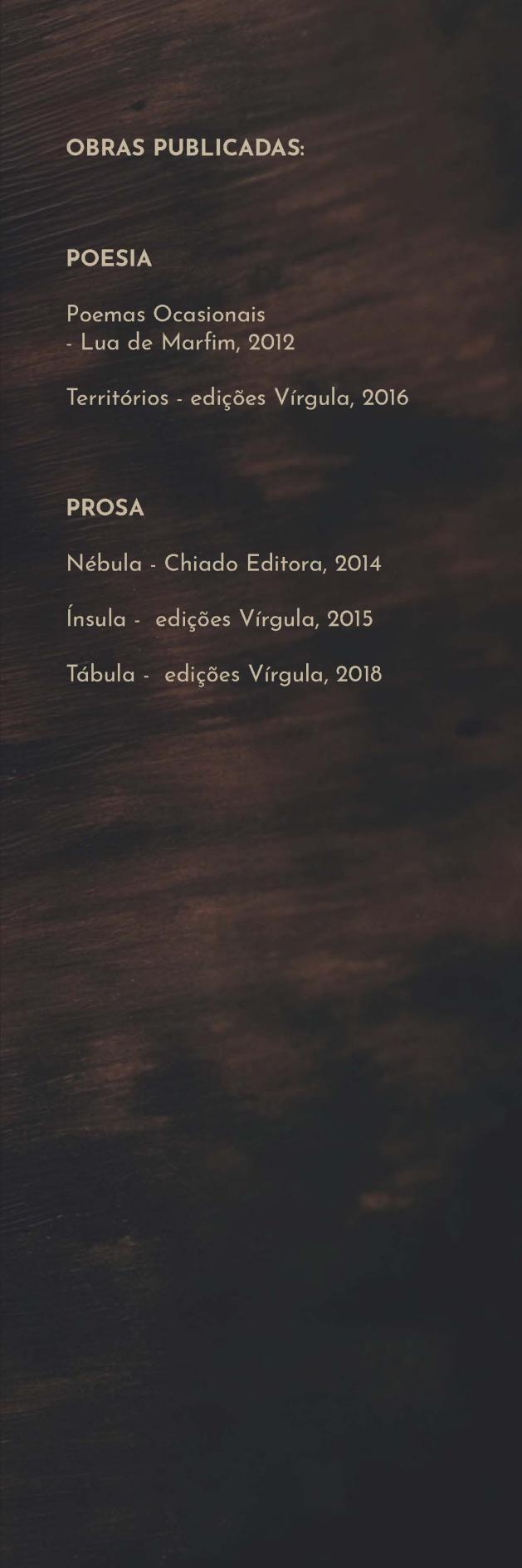 se vislumbra ao longe… Talvez sejas tu que a imaginas impelido pela contemplação a que te dedicas no dia após dia das tuas visões sumptuosas . Aprende comigo . Eu nasci antes de tudo isso . Conheço o que quer dizer ficar. Ficar de fora, ficar longe, ficar para depois, ficar para nunca ser . Eu fui puxada ainda antes de nascer, é a única explicação possível, é uma das minhas mais caras simplificações, de facto. Ouve o que não quiseram que ouvisses, sofre o que não quiseram que sofresses . Um ventre abre-se para que venhas ao mundo, e depois o mundo abandona-te . Outros, como tu supões, nascem com o mundo a seus pés .