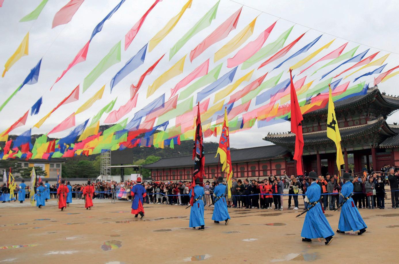 Festejos no palácio real de Gyeongbokgung, Seul, Coreia do Sul