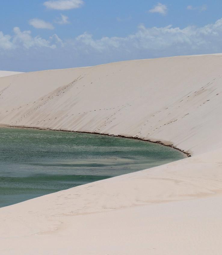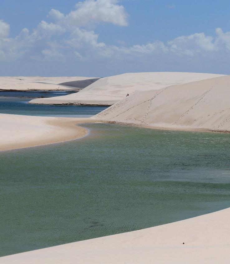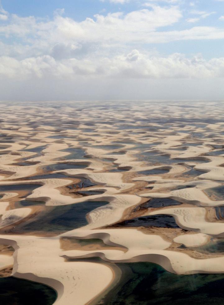 Quatro horas para leste, por estrada só há poucos anos alcatroada na sua totalidade, cheguei a Barreirinhas, o principal ponto de acesso ao Parque Nacional dos Lençóis Maranhenses, uma maravilha natural fantástica, que conhecia por imagens, uma extensa zona dunar, formada pela constância dos ventos alísios. Todo o nordeste tem muitas dunas, mas estas destacam-se pela sua dimensão (1565 km2, cerca de duas vezes a ilha da Madeira), pela sua cor (uma areia quase branca) e pela sua estrutura, em que os baixos entre as dunas retêm a água das chuvas durante alguns meses. Os «lençóis» são isso mesmo: uma sucessão a perder de vista de dunas brancas intercaladas com lagoas azuladas, numa paisagem de outro mundo. Algumas lagoas duram poucos dias, a maioria uns meses, Preview