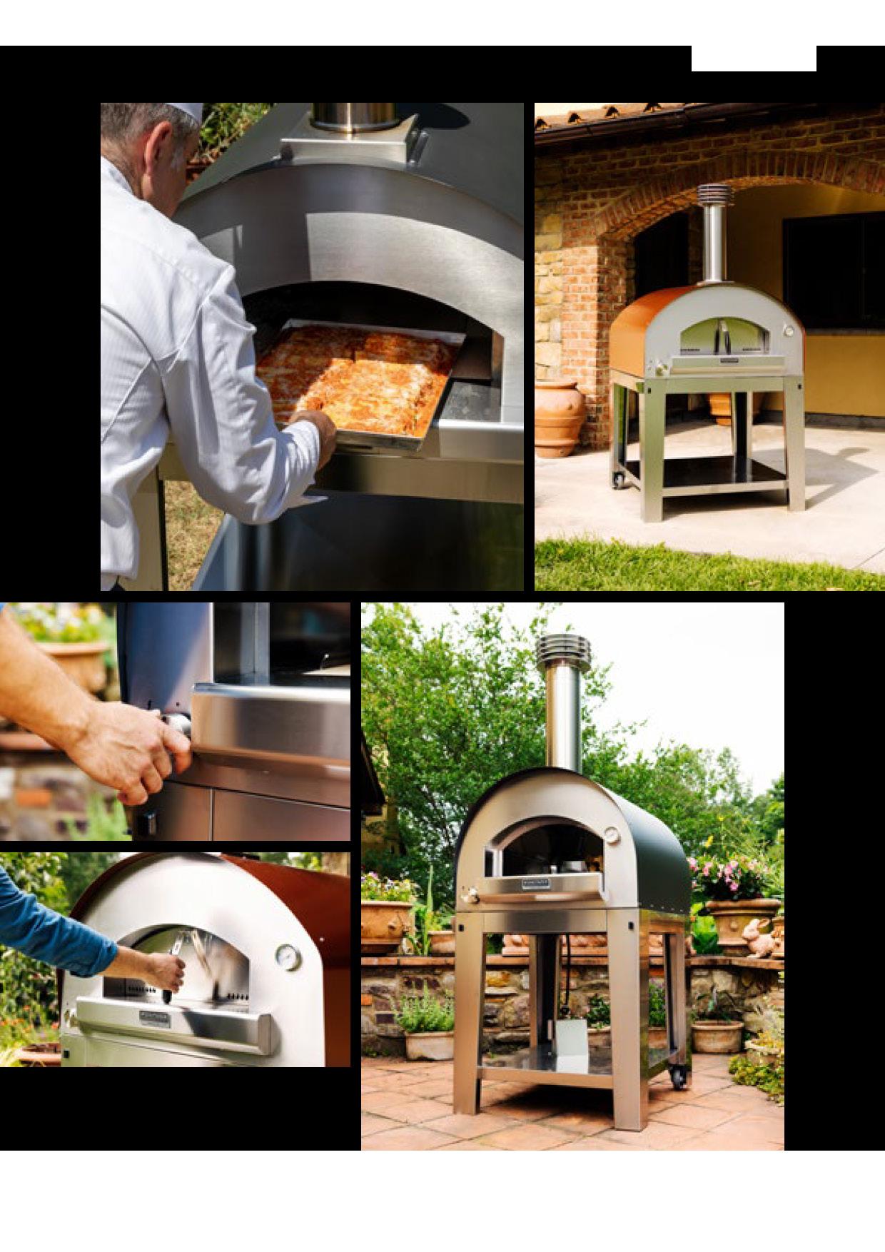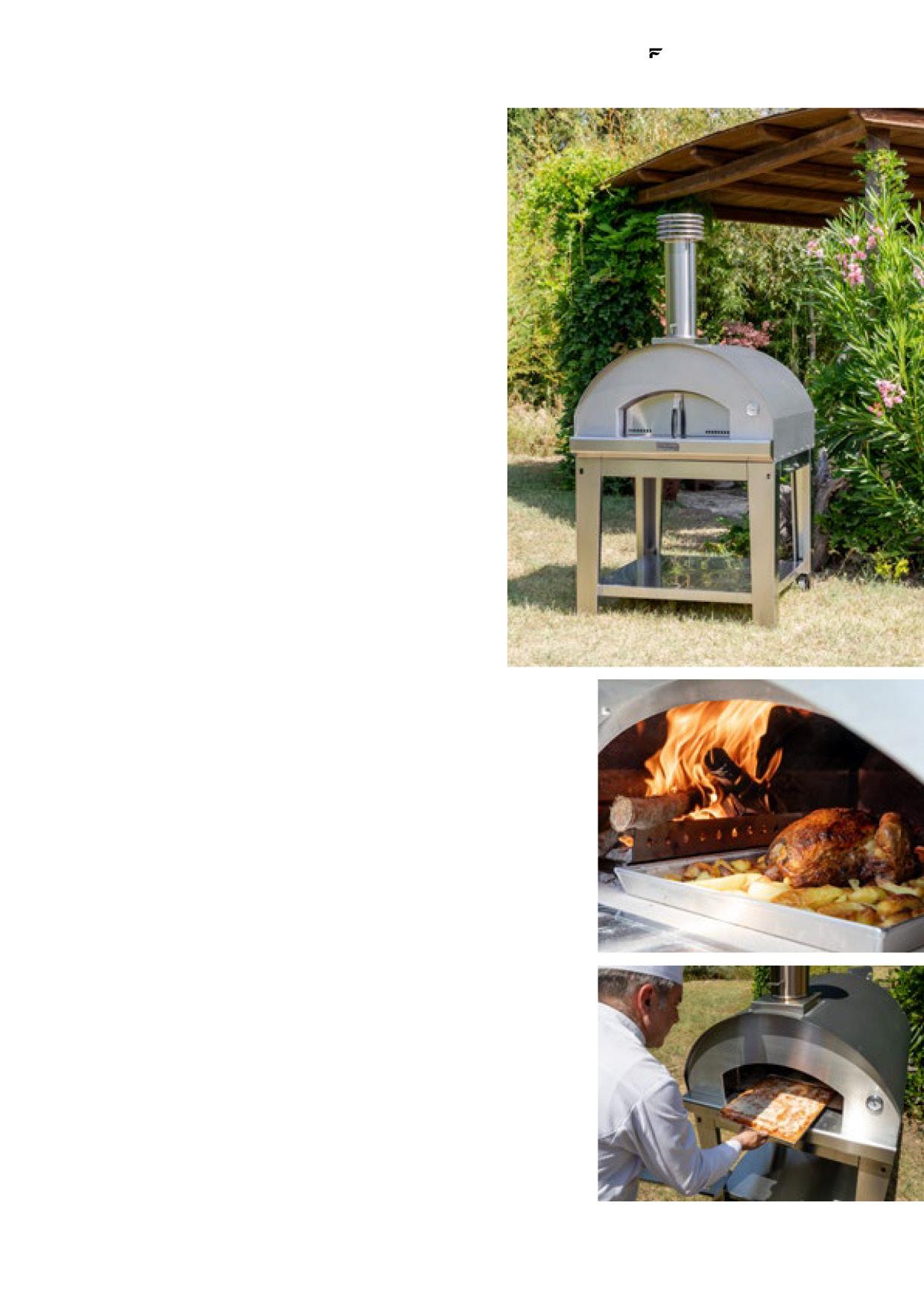 Wood-fired pizza ovens are designed to offer high performance and maximum practicality, ideal for outdoor cooking with the authentic taste of tradition. The cooking surface, made of high quality refractory chamotte certified for food use, ensures uniform and flawless cooking, while the internal stainless steel structure and external powder-coated galvanised sheet metal with Qualicoat treatment guarantee resistance to heat and weathering (the use of a dedicated cover is always recommended in order to keep the product in optimal condition over time).