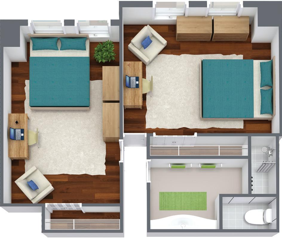 l Students share a room with one other student and up to four people share a bathroom.