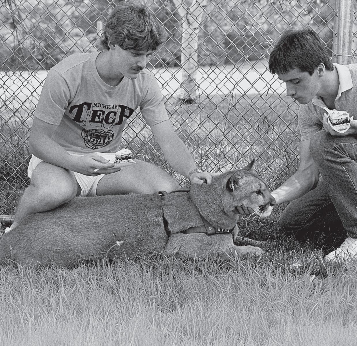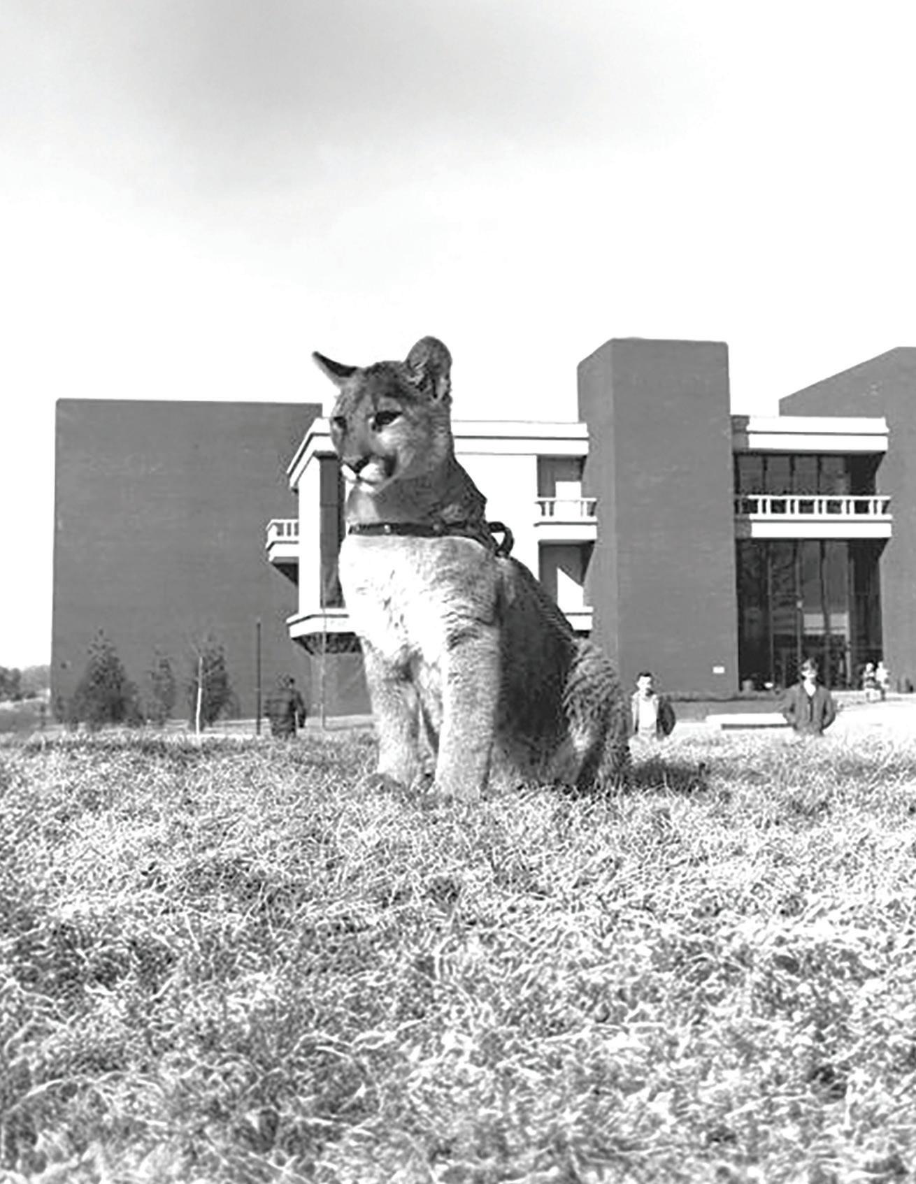 In 1986, SIUE welcomed to campus its first live mascot, a spirited cougar cub named Chimega. She lived in a geodesic dome designed by Buckminster Fuller and was well taken care of by trained handlers and student volunteers called the Cougar Guard. She was a beloved presence across campus and attended sporting events, parades, and other activities across the region. For 17 years, Chimega embodied Cougar pride, greeting students, alumni, and community members alike. Decades later, Chimega’s legacy brings back vivid memories and the joy of seeing SIUE’s live mascot in action.