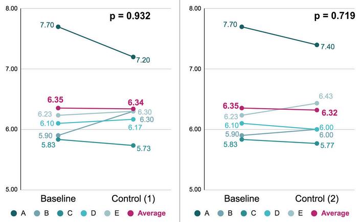 No SS difference on CPS score between baseline and 2 control tests - no change in motor performance. Suggests any variation in motor performance for other groups is only from placebo effect, not other factors (effect of practice).