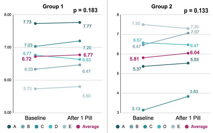 No SS difference on CPS score between baseline and after one placebo pill for Groups 1 & 2 - no motor improvement.