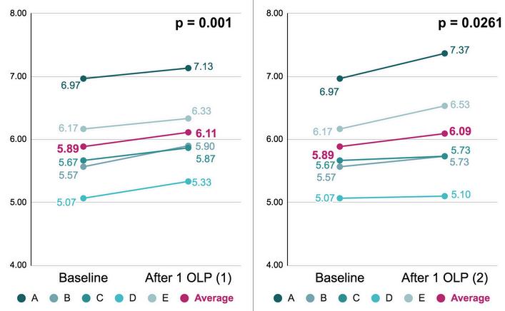 A paired t-test showed if there was a statistically significant (SS) difference between baseline and mean CPS score for each intervention (5% significance level). All data met the paired t-test assumptions of normal distribution, according to the Shapiro-Wilk test.